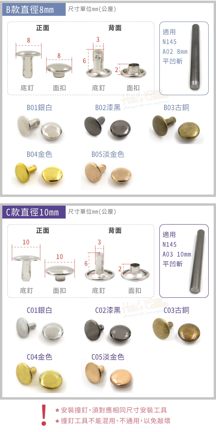 若使用不同大小的工具或撞釘,會造成扣子變形及損壞