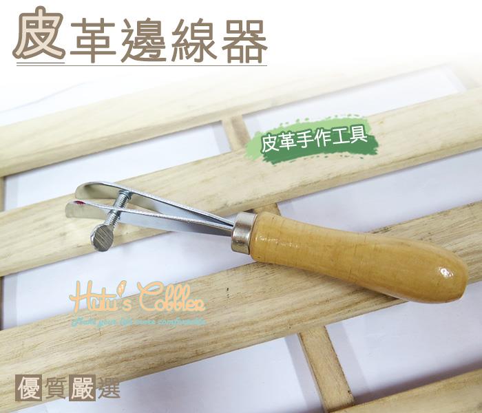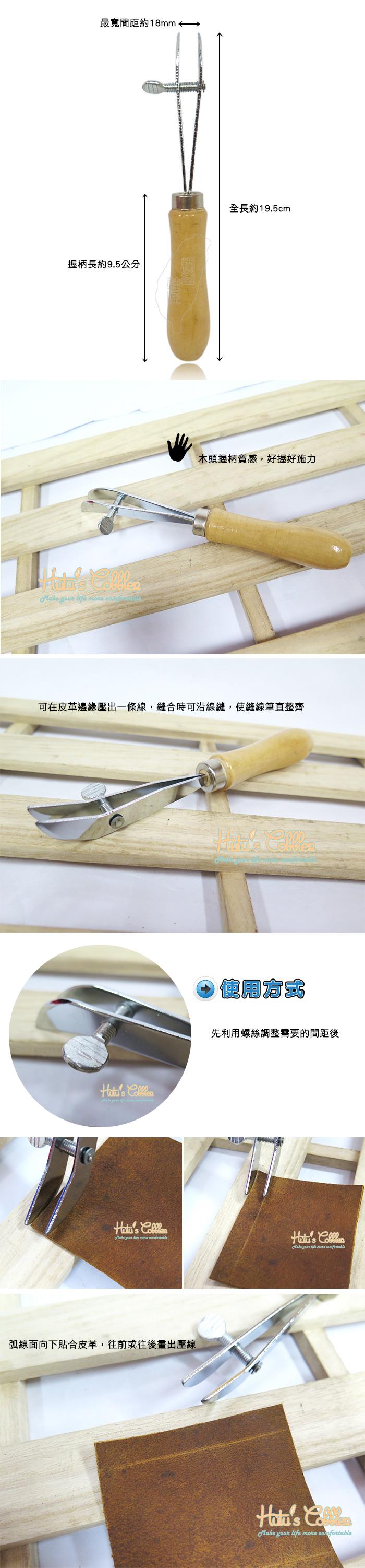 先利用螺絲調整需要的間距後,弧線面向下貼合皮革,往前或往後畫出壓線。