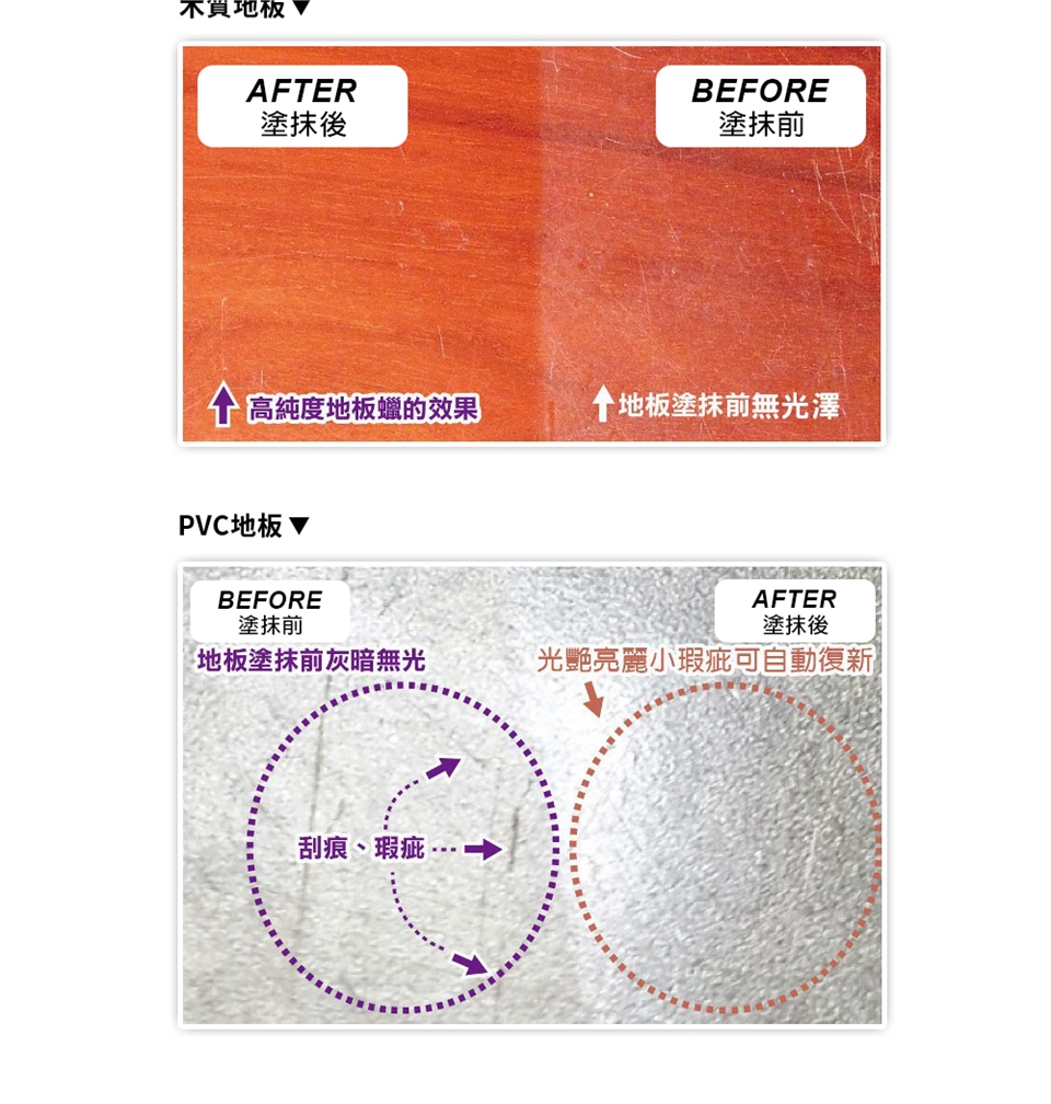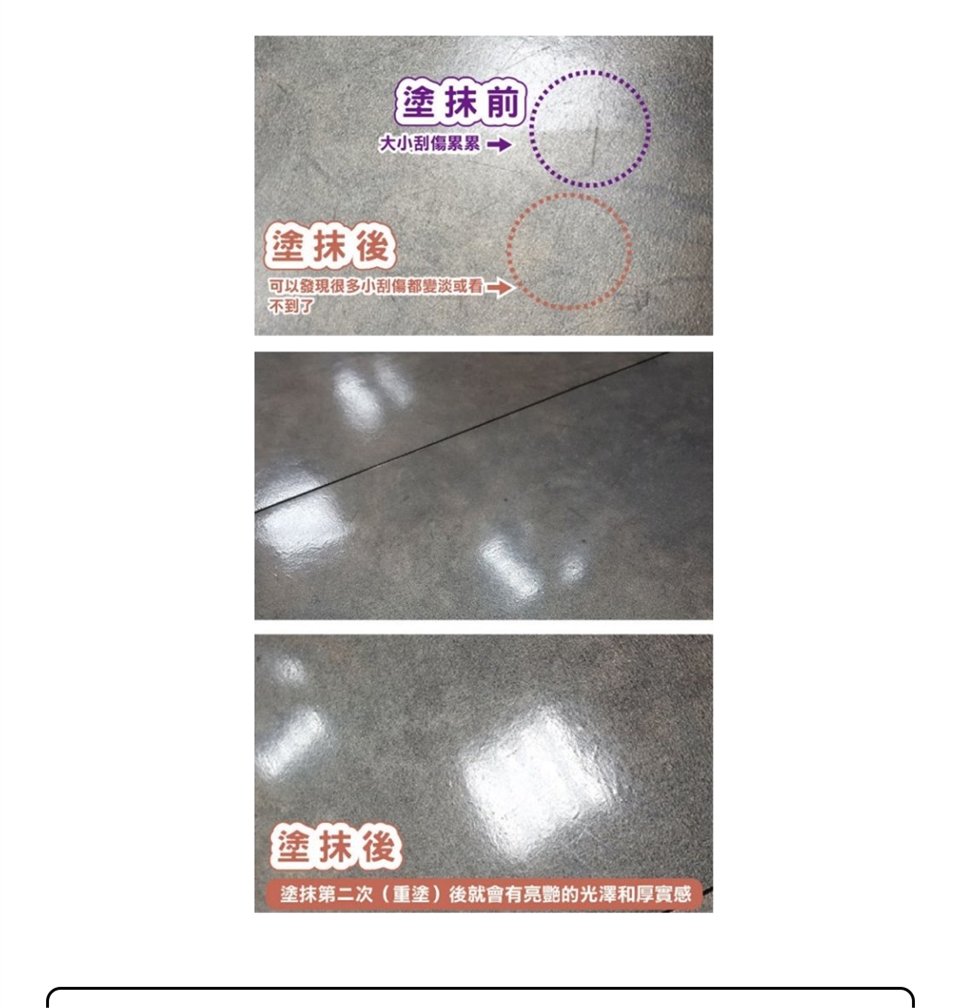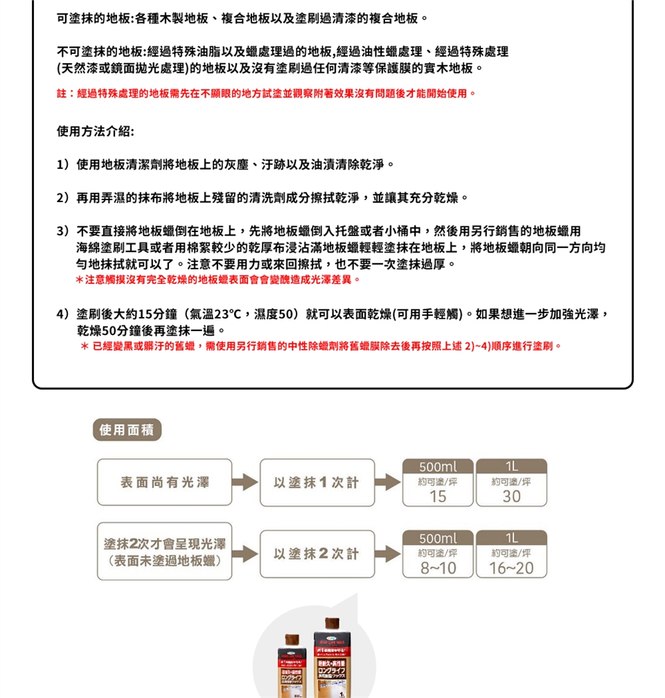 ※不適用:地板表面經過油性著色劑、油脂、蠟或鏡面拋光等特殊處理的地板,以及未塗過漆的實木(原木)地板。(註:已經老舊或已磨損的拋光磚則可塗)