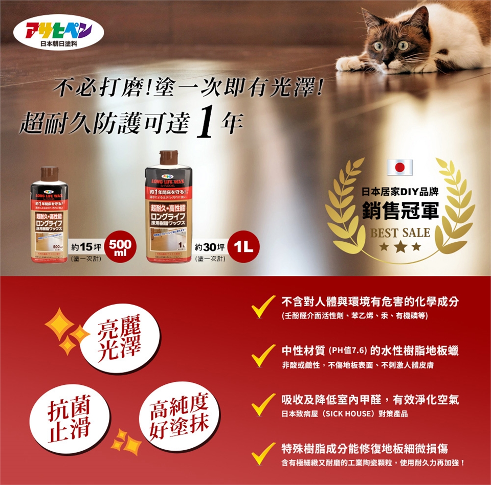 ●塗抹後可防滑、不必打磨,重塗一次即有高雅光澤。