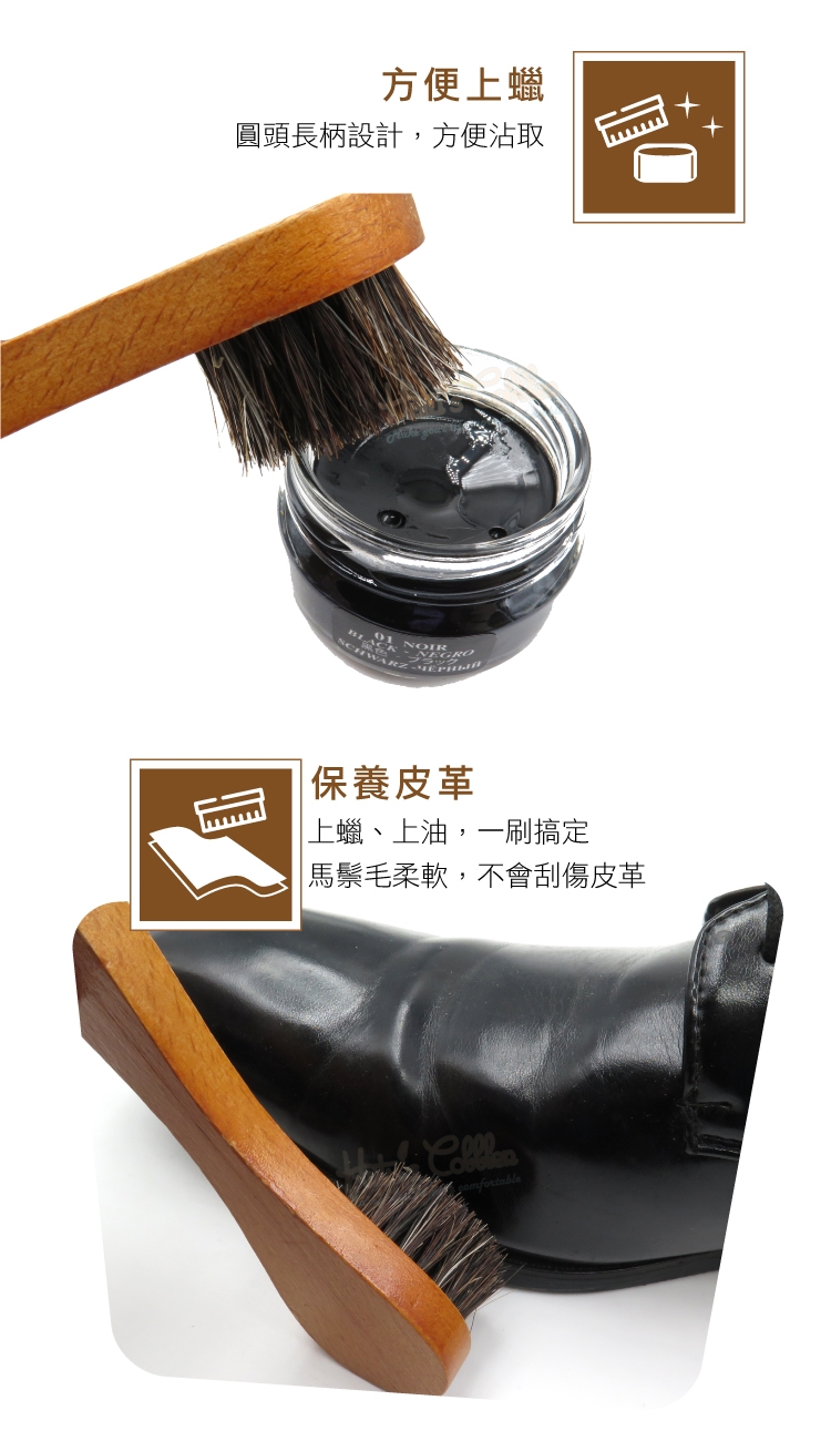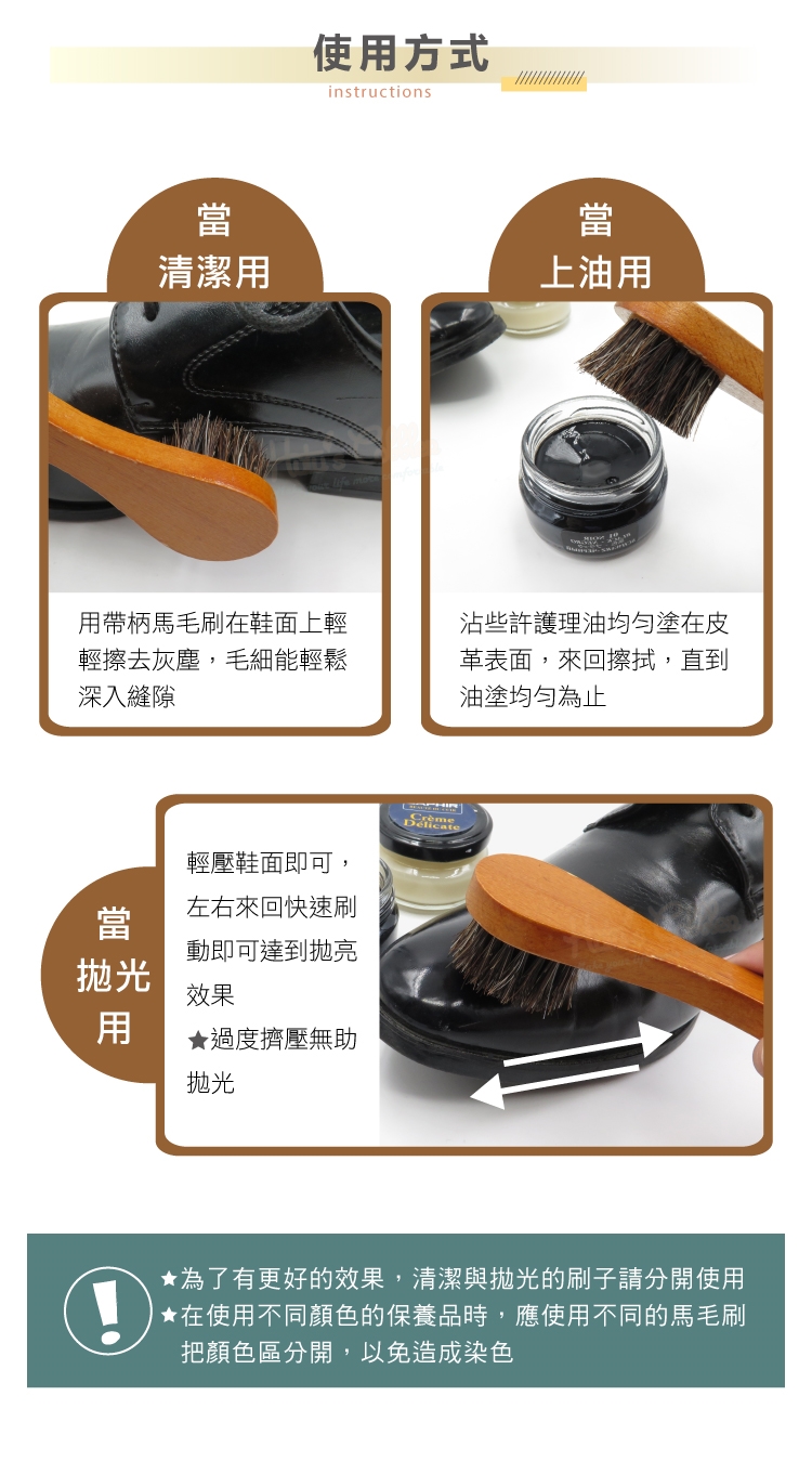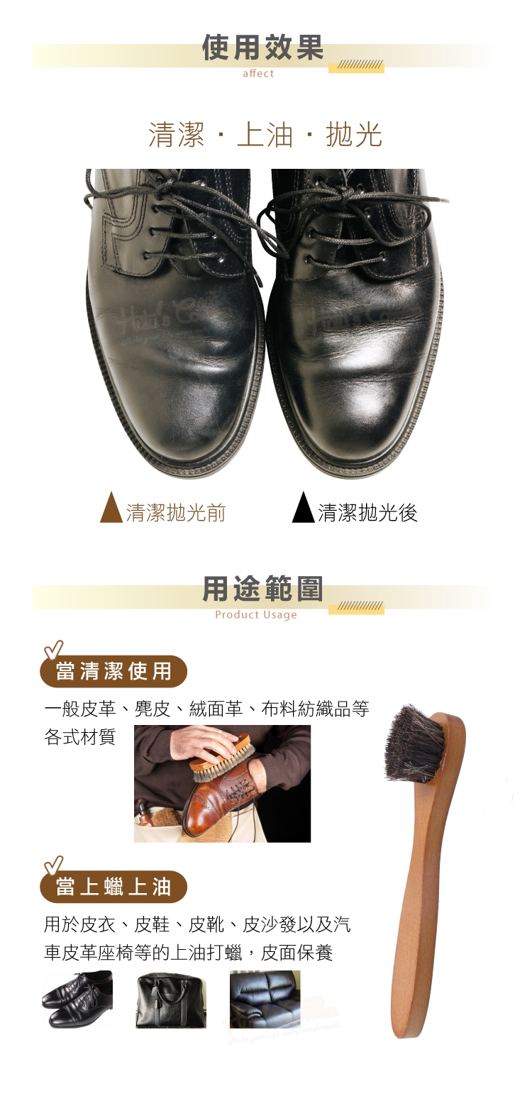 3.保養皮革-上蠟、上油,一刷搞定,馬鬃毛柔軟,不會刮傷皮革。