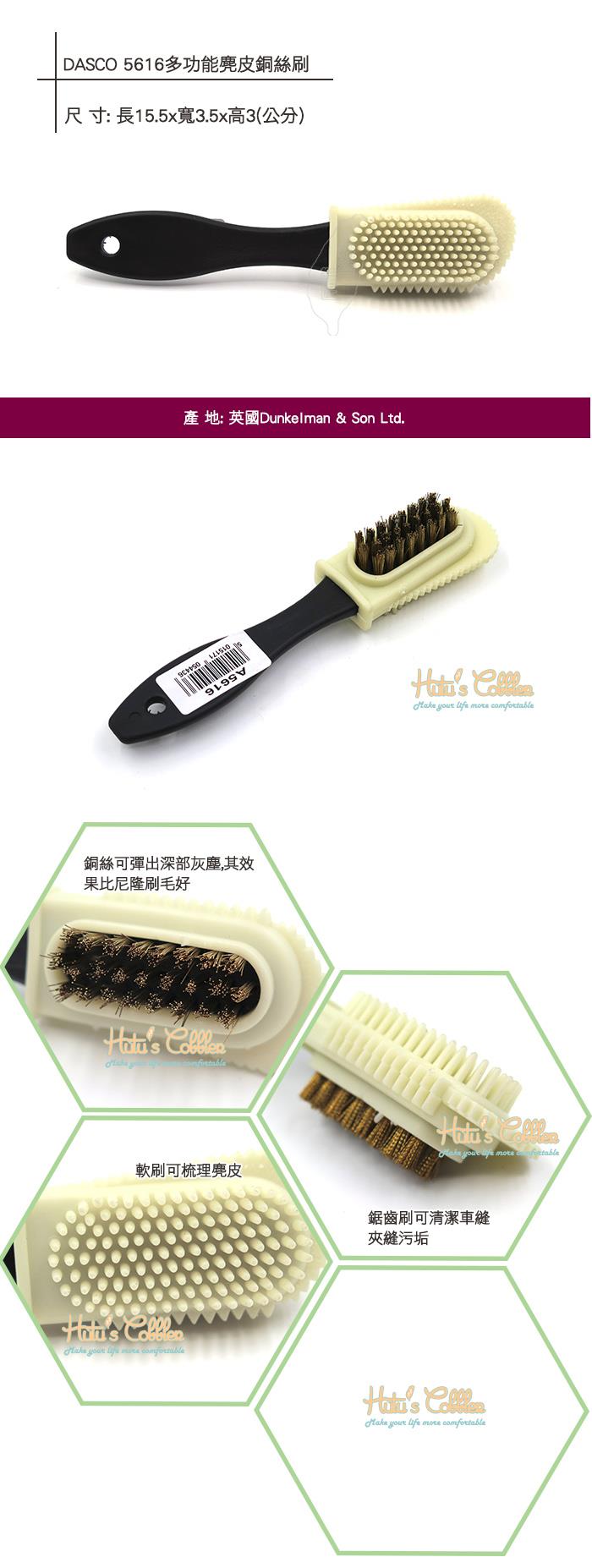 功 能: 軟刷可梳理麂皮.銅絲可彈出深部灰塵,鋸齒刷可清潔車縫夾縫污垢.