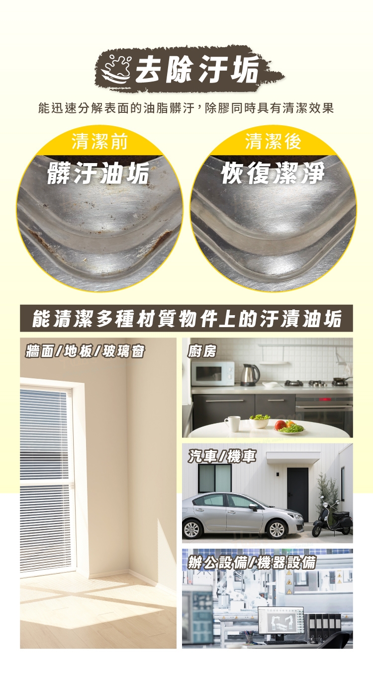 能迅速分解表面的油脂汙漬、油垢、塵垢,除膠同時具有清潔效果