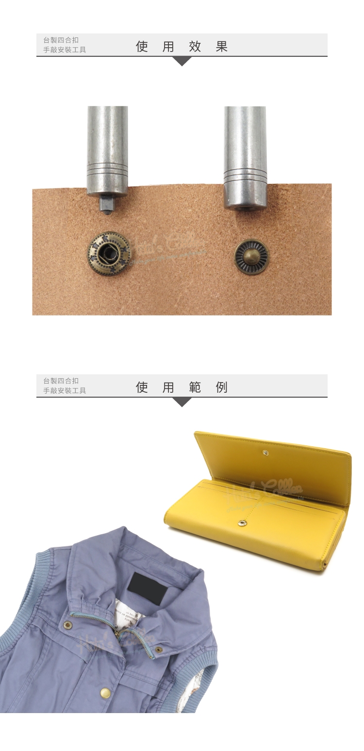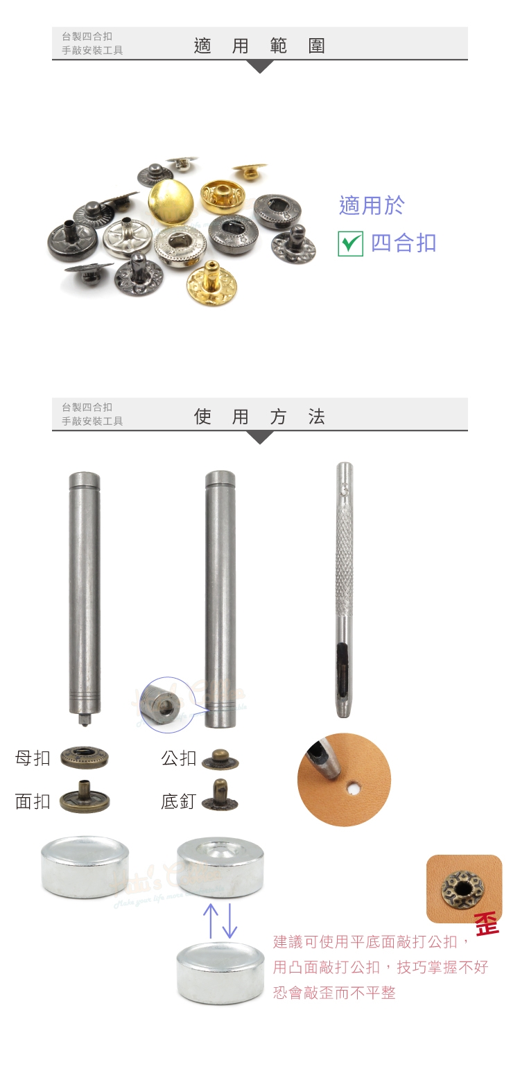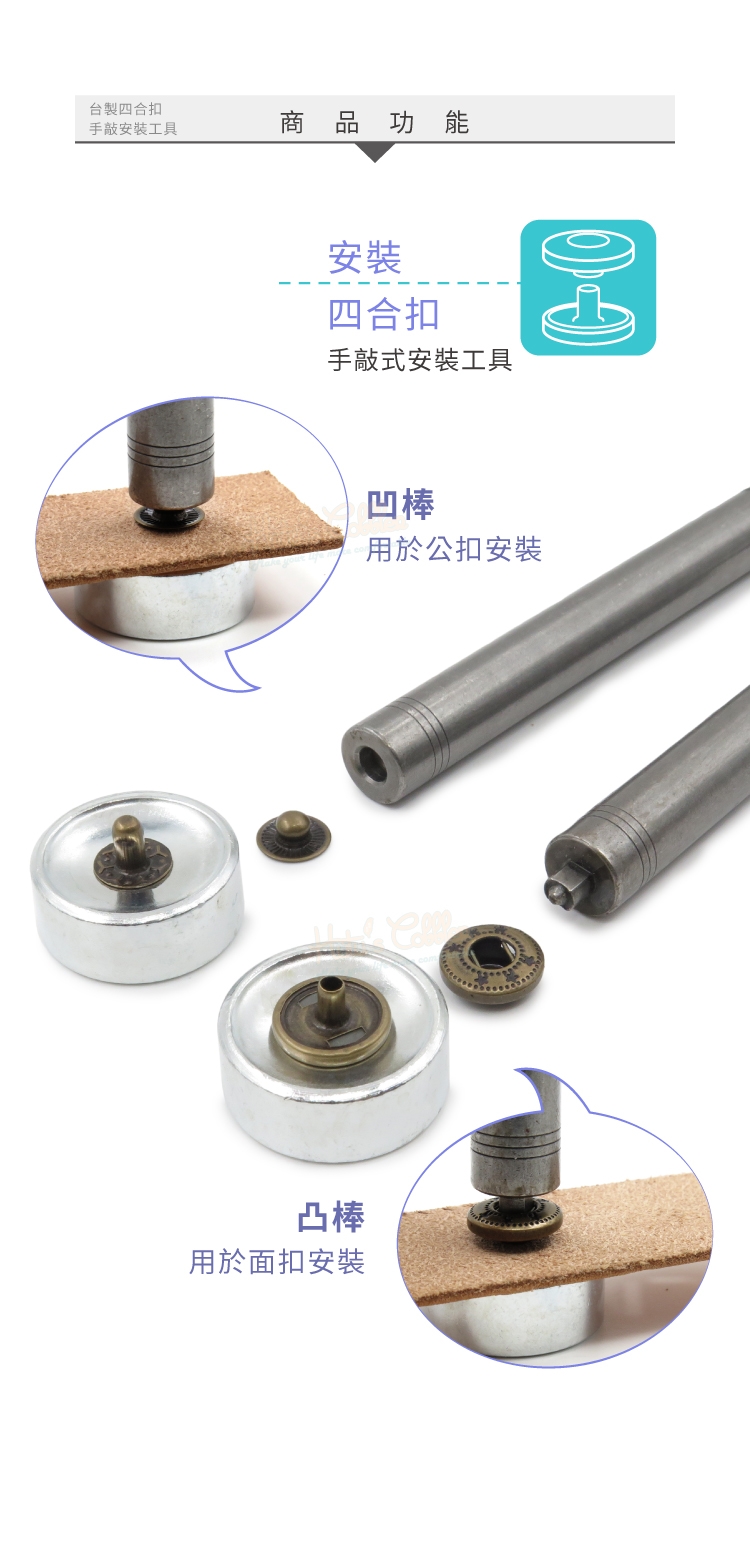 1.安裝四合扣:手敲式安裝工具,凹棒用於公扣安裝,凸棒用於面扣安裝