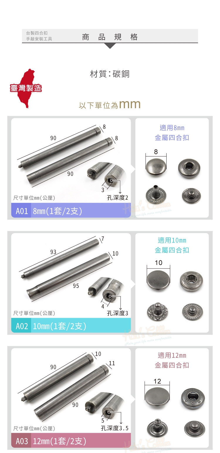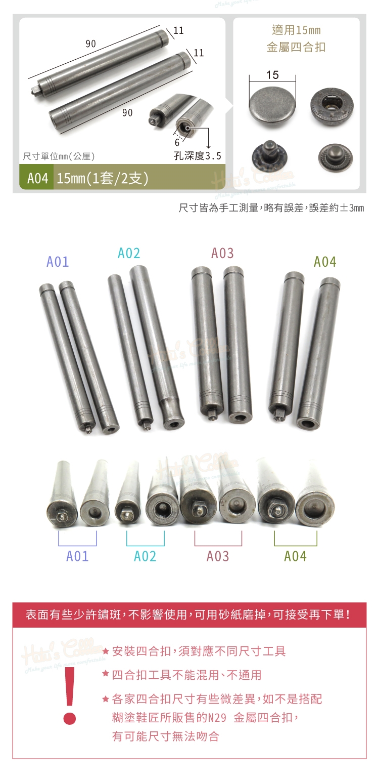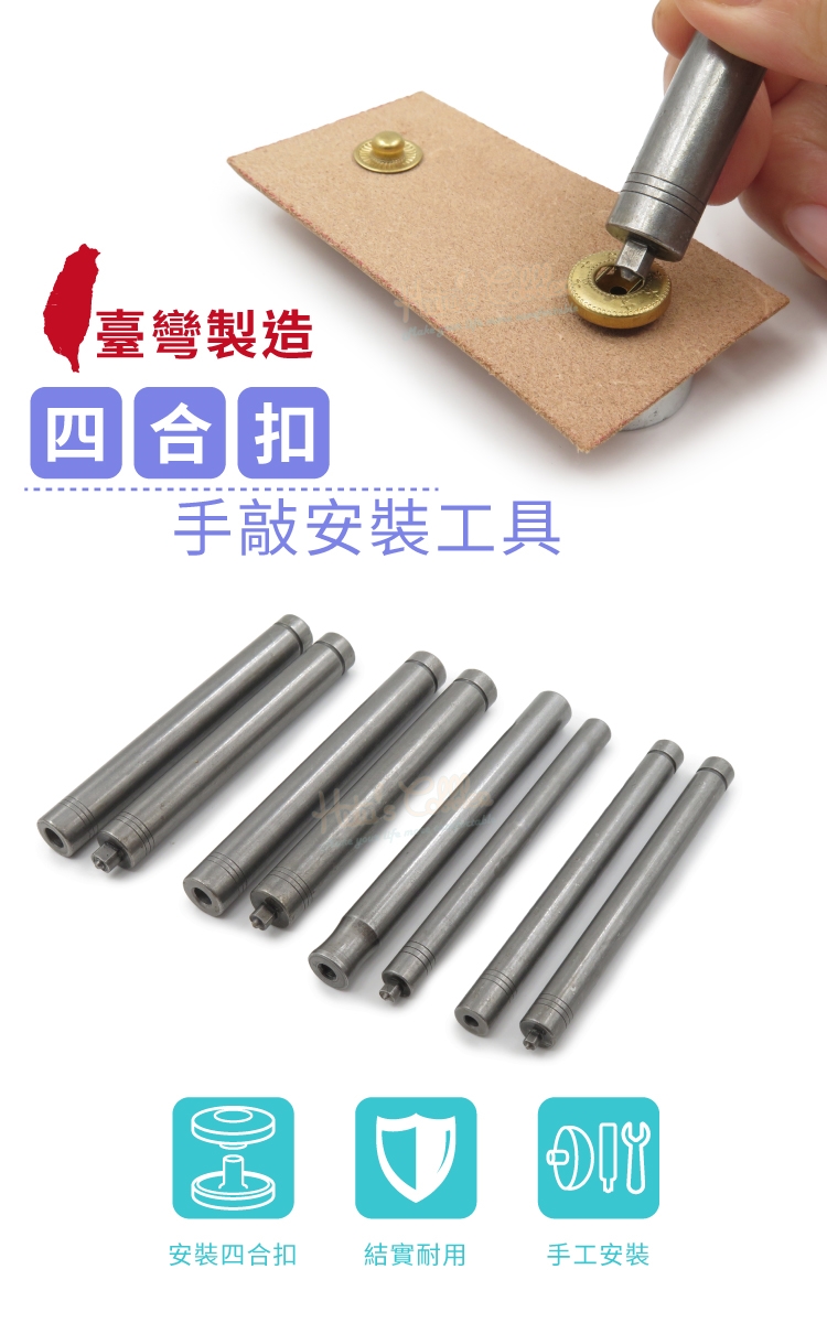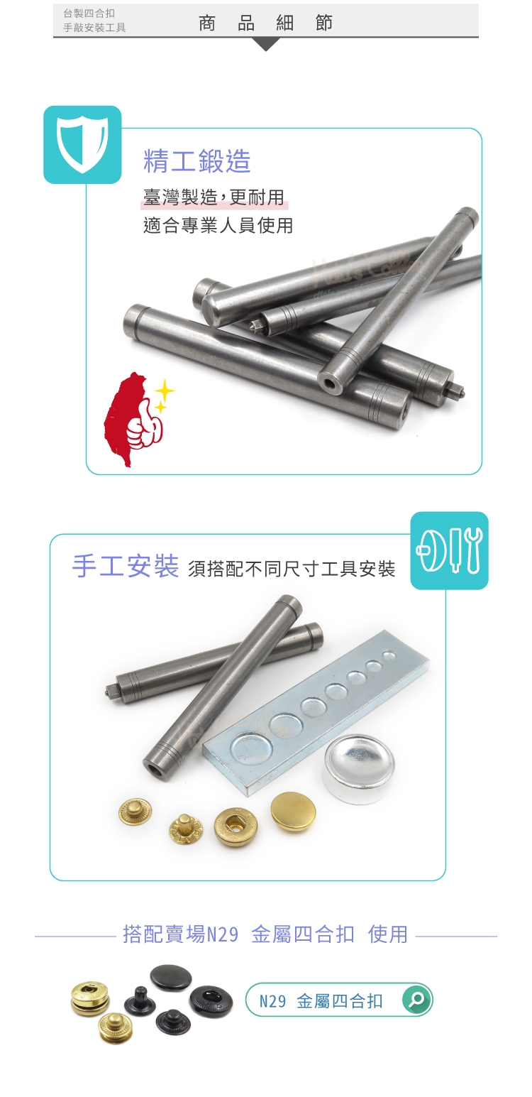1.安裝四合扣:手敲式安裝工具,凹棒用於公扣安裝,凸棒用於面扣安裝
