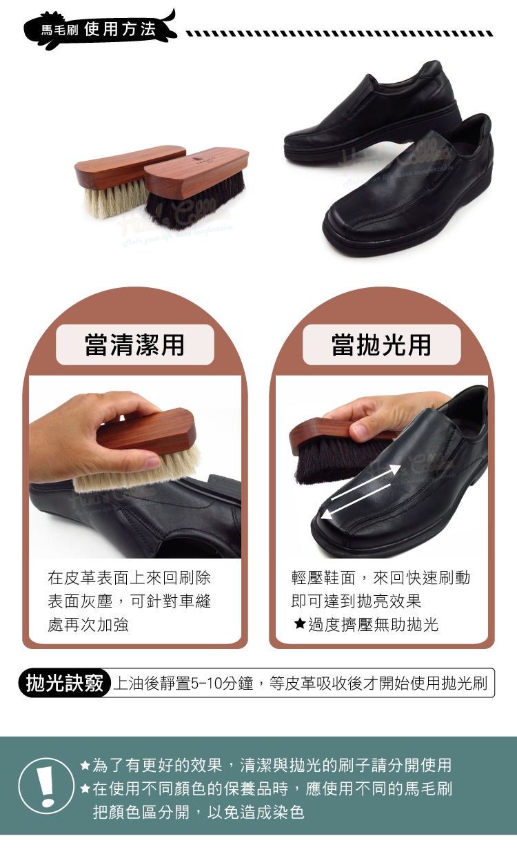 拋光訣竅:上油後靜置5-10分鐘,等皮革吸收後才開始使用拋光刷