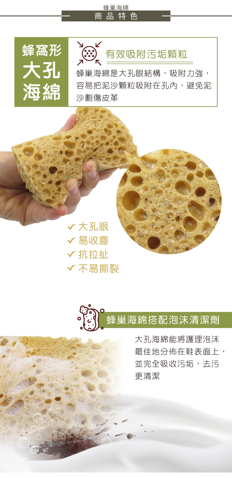 大孔海綿能將護理泡沫最佳地分佈在鞋表面上,