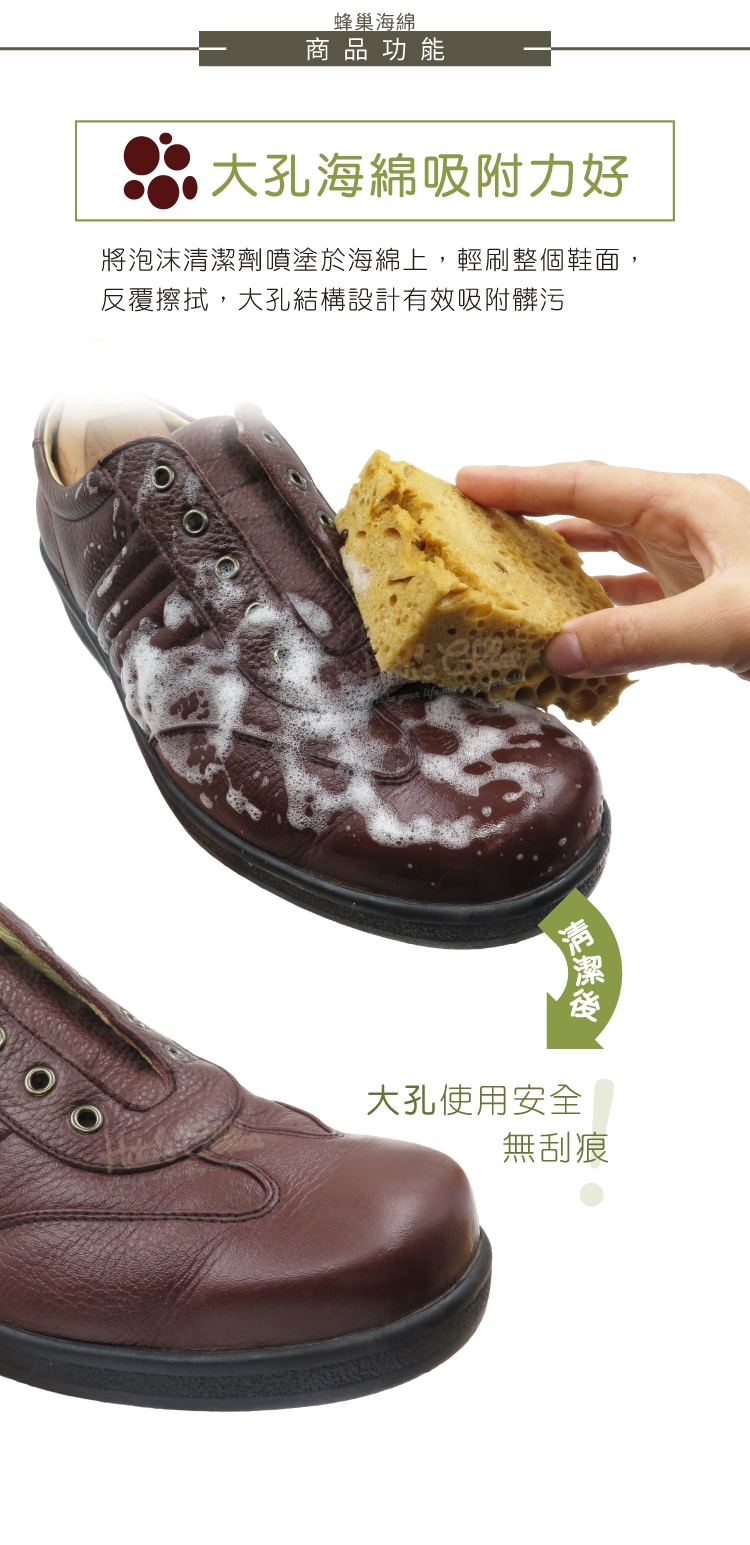 輕刷整個鞋面,反覆擦拭,大孔結構設計有效吸附髒污
