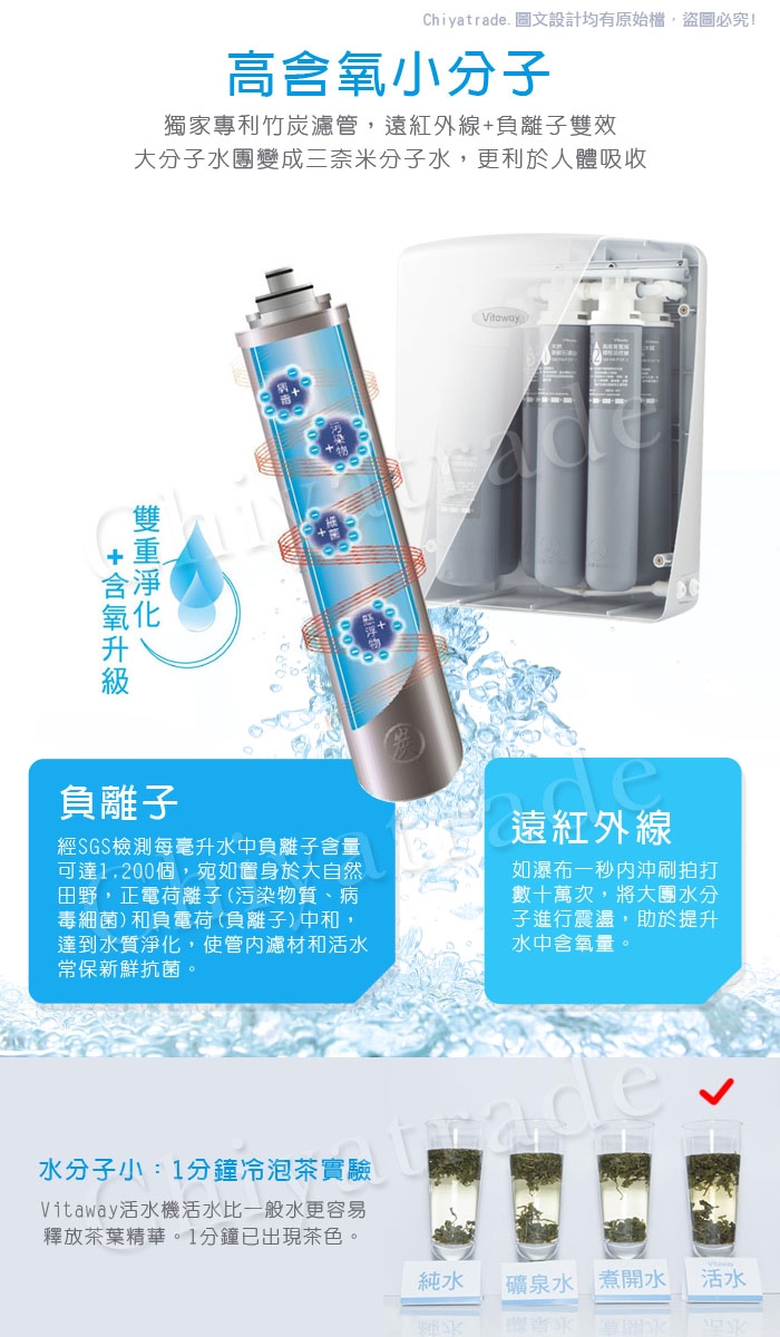 「純淨」、「小分子」、「保留有益礦物質」,可說是好水不可或缺的黃金三要素。Vitaway 維他惠活水機正是這樣優質的淨水器!