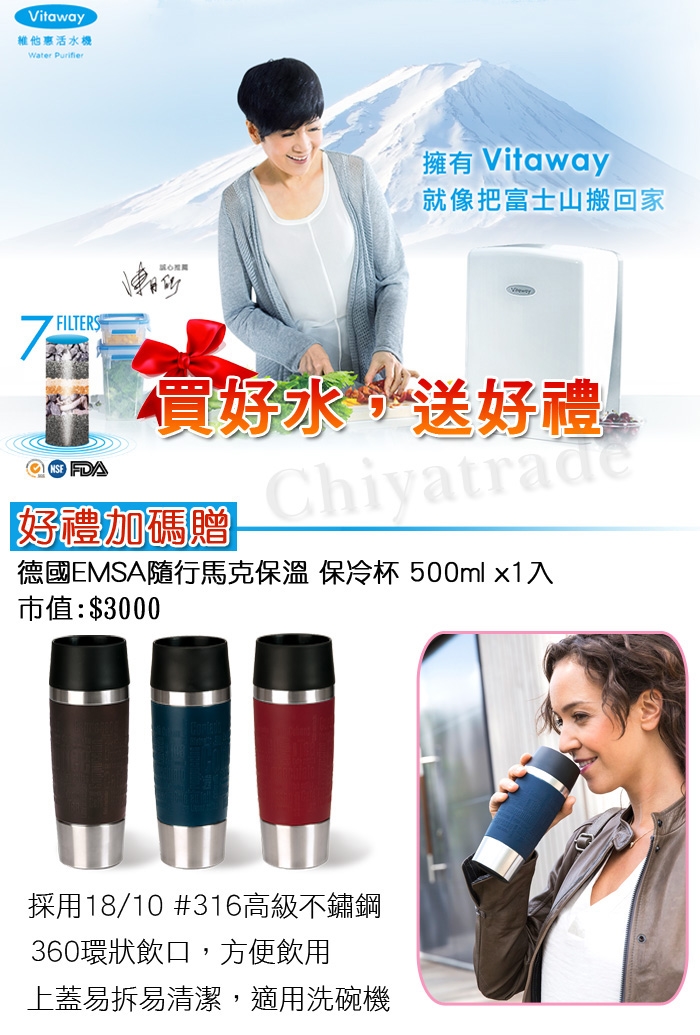 有了Vitaway,不僅讓您在家就能享受到大自然精華的活水,更實現全食物健康飲食的重要環節。還原礦泉地質層層的濾水過程,完整保留人體需要的天然礦物質,呈現天然微鹼性的自然活水,滴滴純淨,口口回甘。這樣自然、簡單又環保省錢的方式,正是我追求的,也誠心推薦給您。只要擁有Vitaway維他惠活水機,在家中就能隨時飲用媲美富士山礦泉水的甘甜好水!」