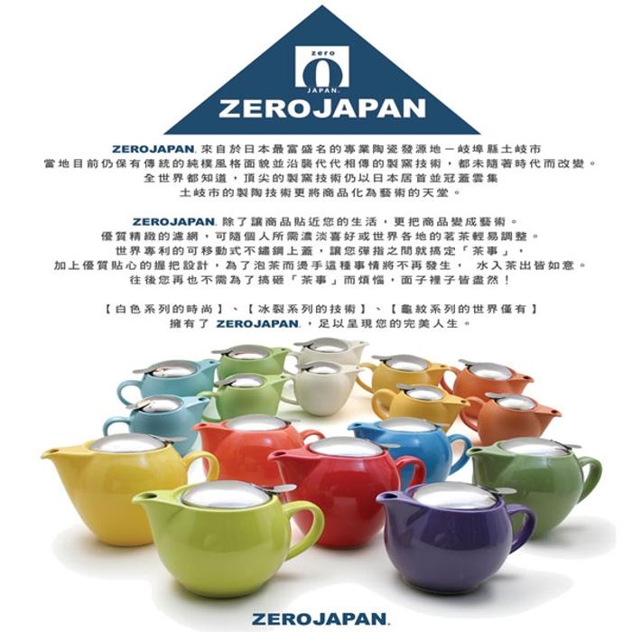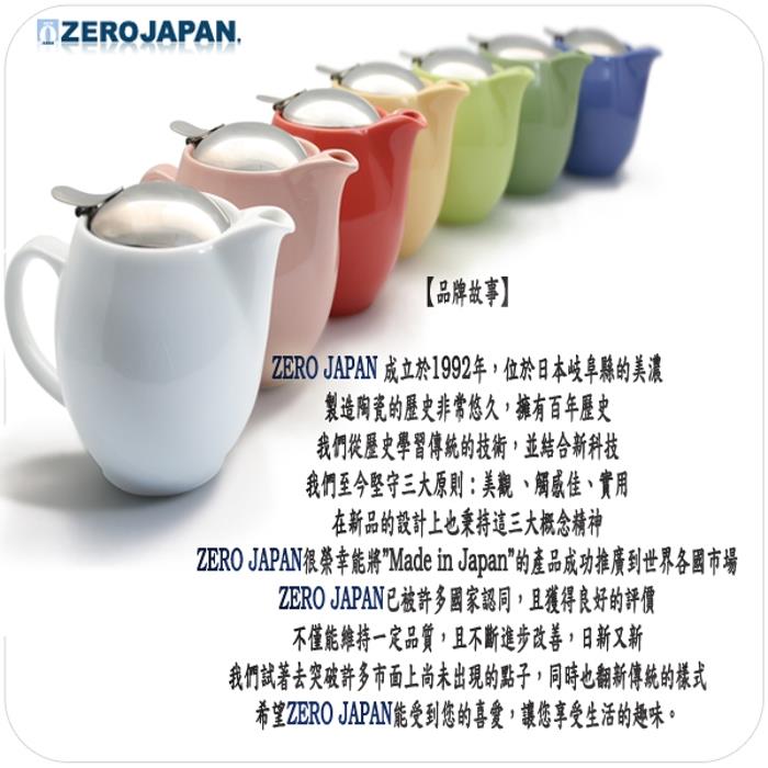 「ZERO JAPAN」為世界知名品牌之一,風行全球。「ZERO JAPAN」茶壺和杯子是100%日本製造,「ZERO JAPAN是日本最大的茶壺和茶具製造商。他們以美妙的設計和精彩繽紛的顏色取悅全世界人。「ZERO JAPAN」採用日本傳統技術製作而成的陶瓷壺,秉持三大原則: Good looking (美觀)、The Good feel (觸感佳)、Very useful(實用),嚴格的逐個檢查產品的質量與生產流程控管並與設計師典雅的設計完美結合。「ZERO JAPAN」受到世界各地高度的評價,這些漂亮的茶壺標榜簡單、至善至美的瓷器,令人驚嘆的形狀,呈現在完美的曲線。許多人也將其當藝術品收藏!繁忙的生活中偶爾也要放慢一下腳步,享受一下精緻品味的茶饗宴,如果您是茶道的愛好者,那麼您更不能錯過 「ZERO JAPAN」系列商品。