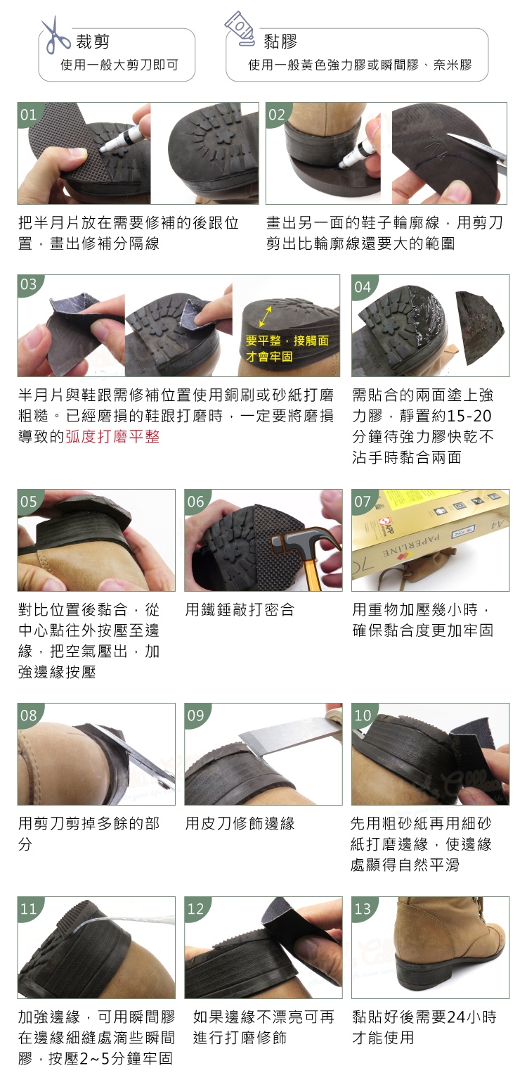 針對鞋跟內側及外側磨損修補,保持鞋底平整