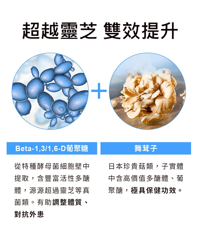 超越靈芝,結構上具有「(1→3)-β葡聚糖主鏈和(1→6)-β葡萄糖基分支」的活性多醣體 β-1,3/1,6 葡聚多醣體含量遠高於菇蕈等真菌類,其差別可達數倍以上。本產品已去除非活性多醣—澱粉等成份,提供完整、純化後的活性多醣,具有調養生理機能與代謝、調整體質、活力健康的作用,是非活性多醣所無法達到的,也是您病後補養的好選擇。