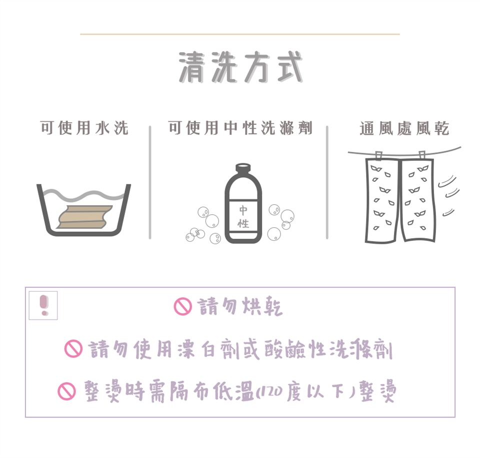 ▲切記勿採用烘乾方式 ▲切勿使用漂白劑或酸鹼性清潔劑洗滌