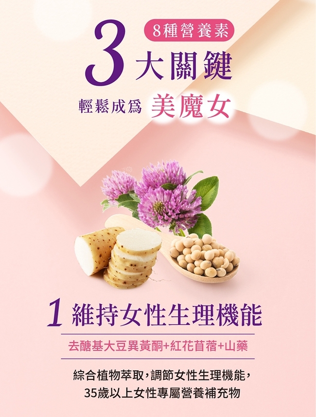 內容物成分: :檸檬酸鈣、山藥粉、大豆萃取物、微結晶狀α-纖維素、聚乙烯吡咯烷酮、保健食品專用膜衣(含羥丙基甲基纖維素、羥丙基纖維素、聚乙二醇)、二氧化矽、紅花苜蓿萃取物(含紅花苜蓿萃取物、麥芽糊精)、芝麻萃取物(含芝麻萃取物、麥芽糊精)、維生素E (含維生素E、辛烯基丁二酸鈉澱粉、麥芽糊精、二氧化矽)、葡萄籽萃取物、硬脂酸鎂、二氧化鈦、維生素D3[含辛烯基丁二酸鈉澱粉、蔗糖、L-抗壞血酸鈉(抗氧化劑)、中鏈三酸甘油酯、二氧化矽、維生素E(抗氧化劑)、維生素D3]、食用紅色四十號鋁麗基、食用黃色五號鋁麗基