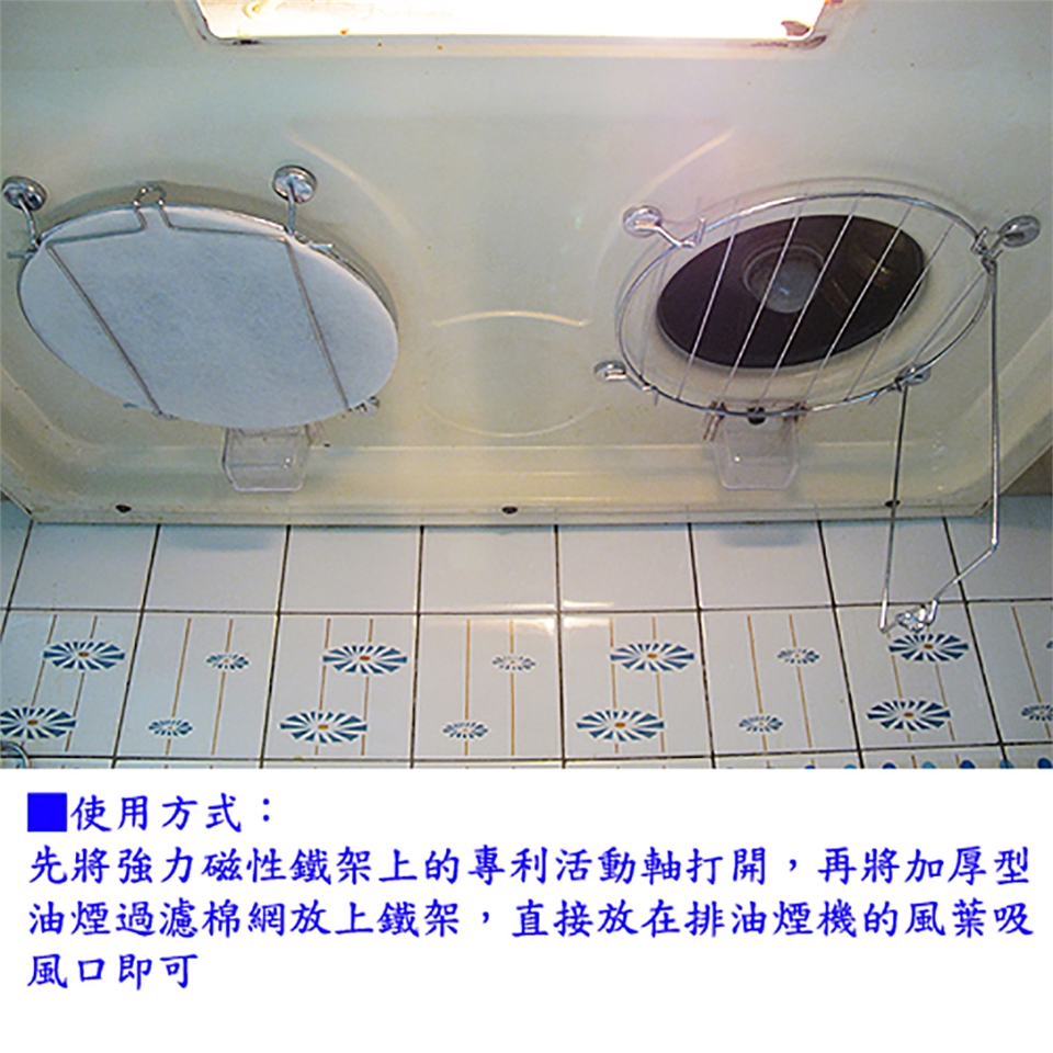先將強力磁性鐵架上的專利活動軸打開,再將加厚型油煙過濾棉網放上鐵架,直接放在排油煙機的風葉吸風口即可。