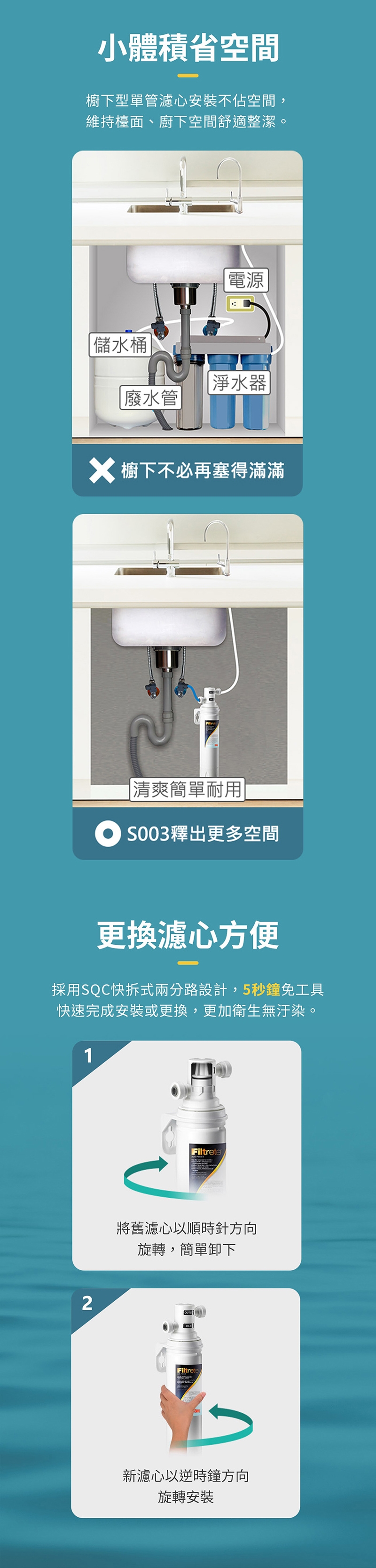 ◆濾心採用SQC快拆式設計,無需扳手與到府維護,自行即可輕鬆更換濾心