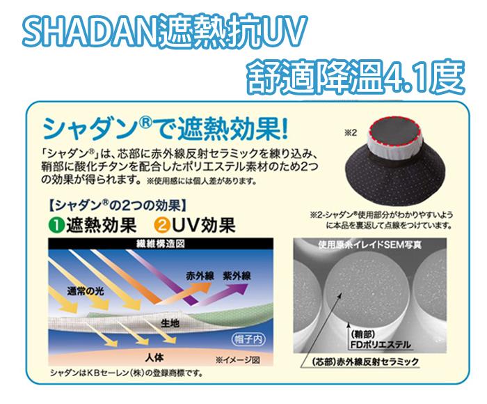 2. 特殊SHADAN遮熱抗UV素材,應用於陽光直射的帽頂內襯,舒適降溫4.1度。