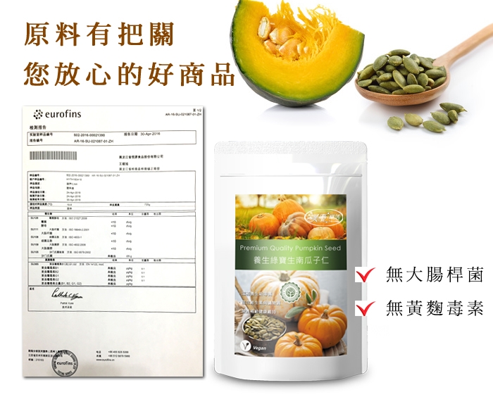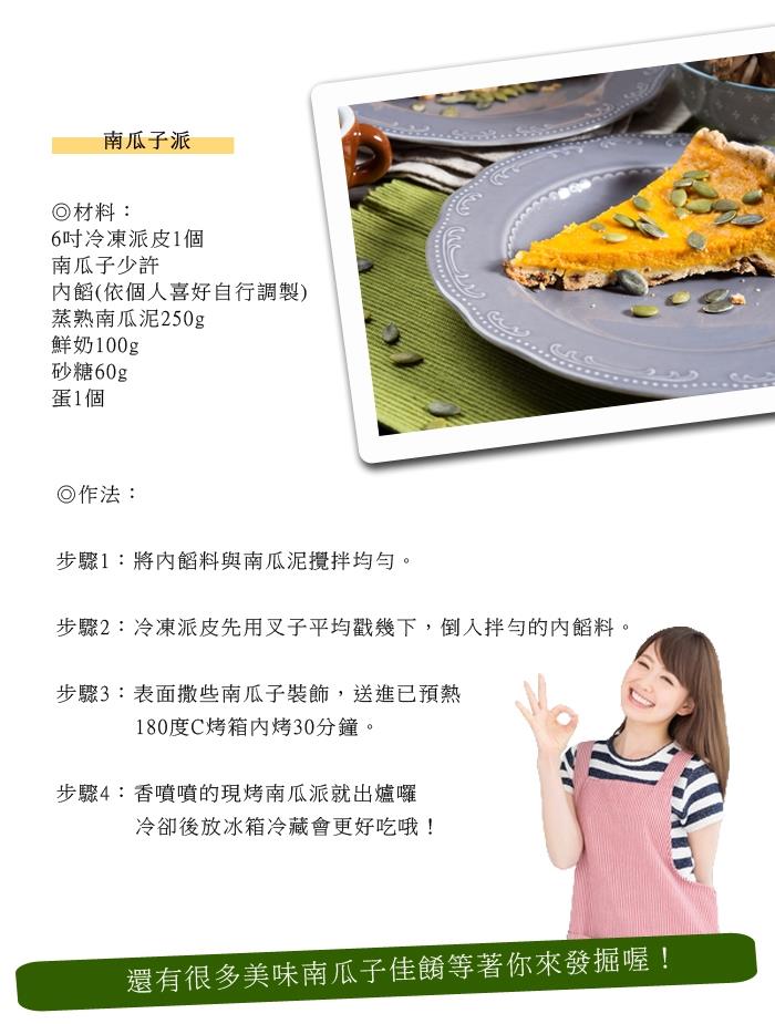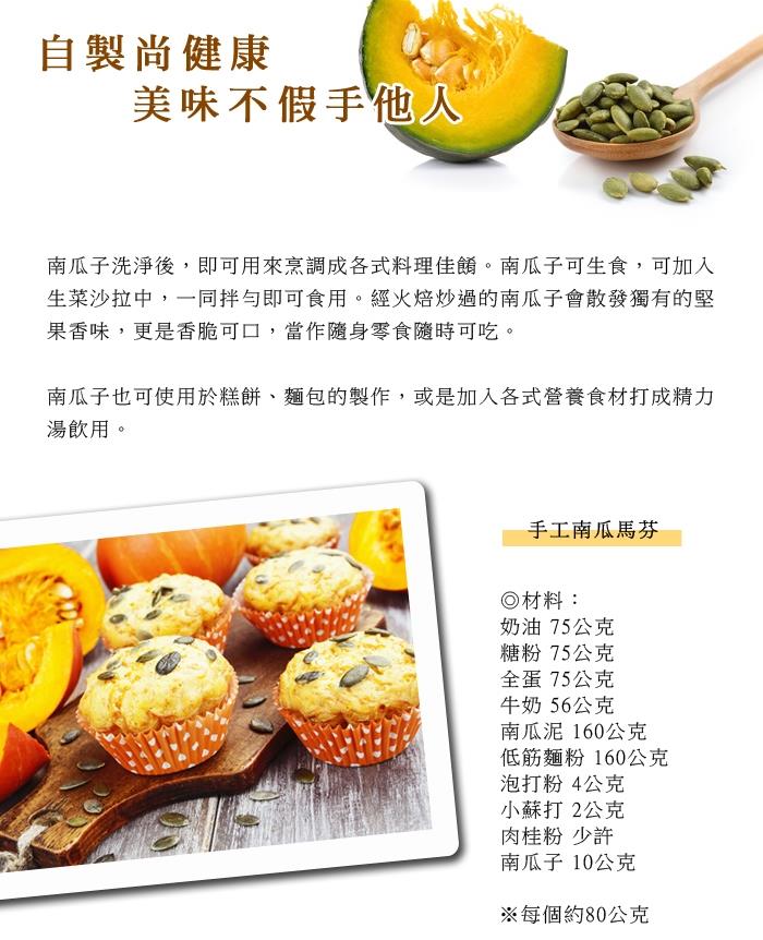 品名:養生綠寶生南瓜子仁 成分:南瓜子仁 淨重:180公克 原產地:中國(台灣分裝) 食用方法:1.自行焙炒後可做為點心食用,每日補充營養。2. 加入生機食材做成生菜沙拉,或打成精力湯。3. 加入豆類、穀類等,打成豆漿、穀奶。4. 加入其他食材烘焙成堅果饅頭、堅果麵包。 保存方法:請放置冰箱冷藏以保新鮮 過敏源資訊:本產品含有南瓜子為堅果類,易食物過敏者請留意,食用前建議詳細確認。 保存期限:12個月 製造/有效期限:標示於包裝 貼心備註:生南瓜子仁(建議低溫烘烤增加堅果香氣與香脆度再食用)