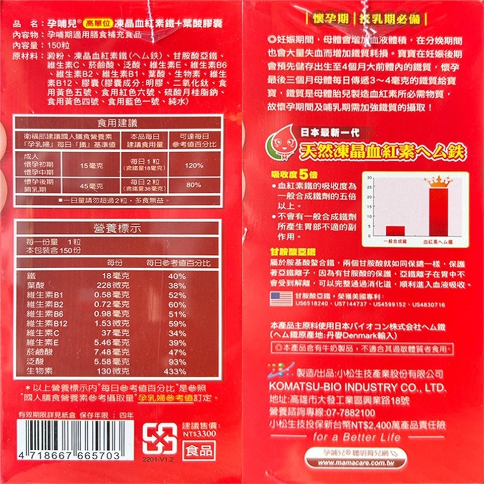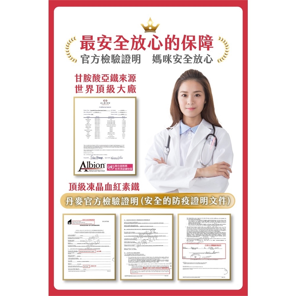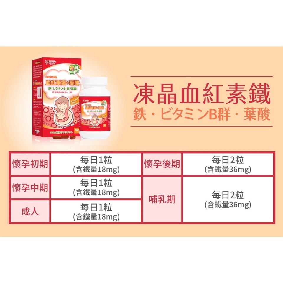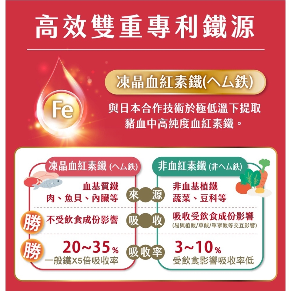 成份:凍晶血紅素鐵、甘胺酸亞鐵、維生素C、菸鹼酸、泛酸、維生素E、維生素B6、維生素B2、維生素B1、葉酸、生物素、維生素B12