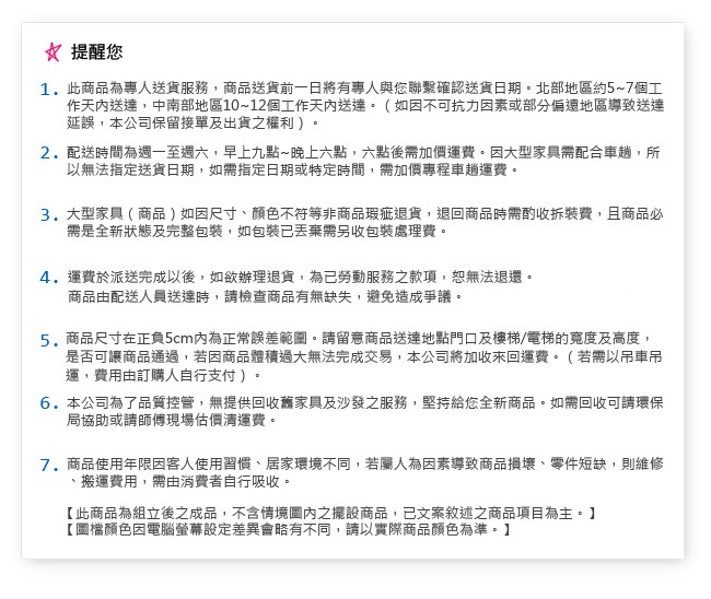 ●商品送貨前一日會先行通知。因大型家具需配合車趟,司機無法在原地等待,所以無法指定送貨日期與時間;如需指定日期或特定時間,需加價專程車趟運費,不便之處請見諒。