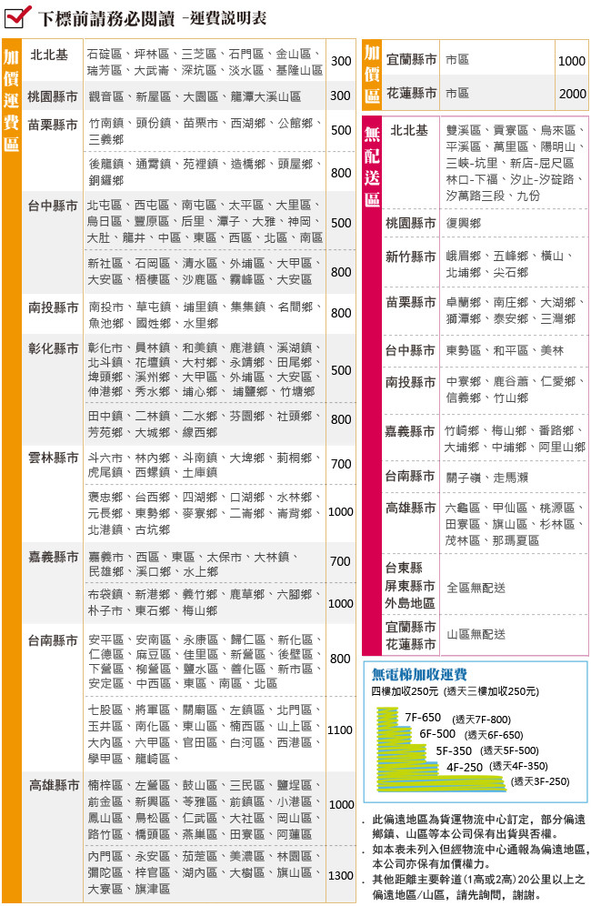 ●運費:依地區不同需收取運費,詳細運費金額請見網頁呈現及說明。