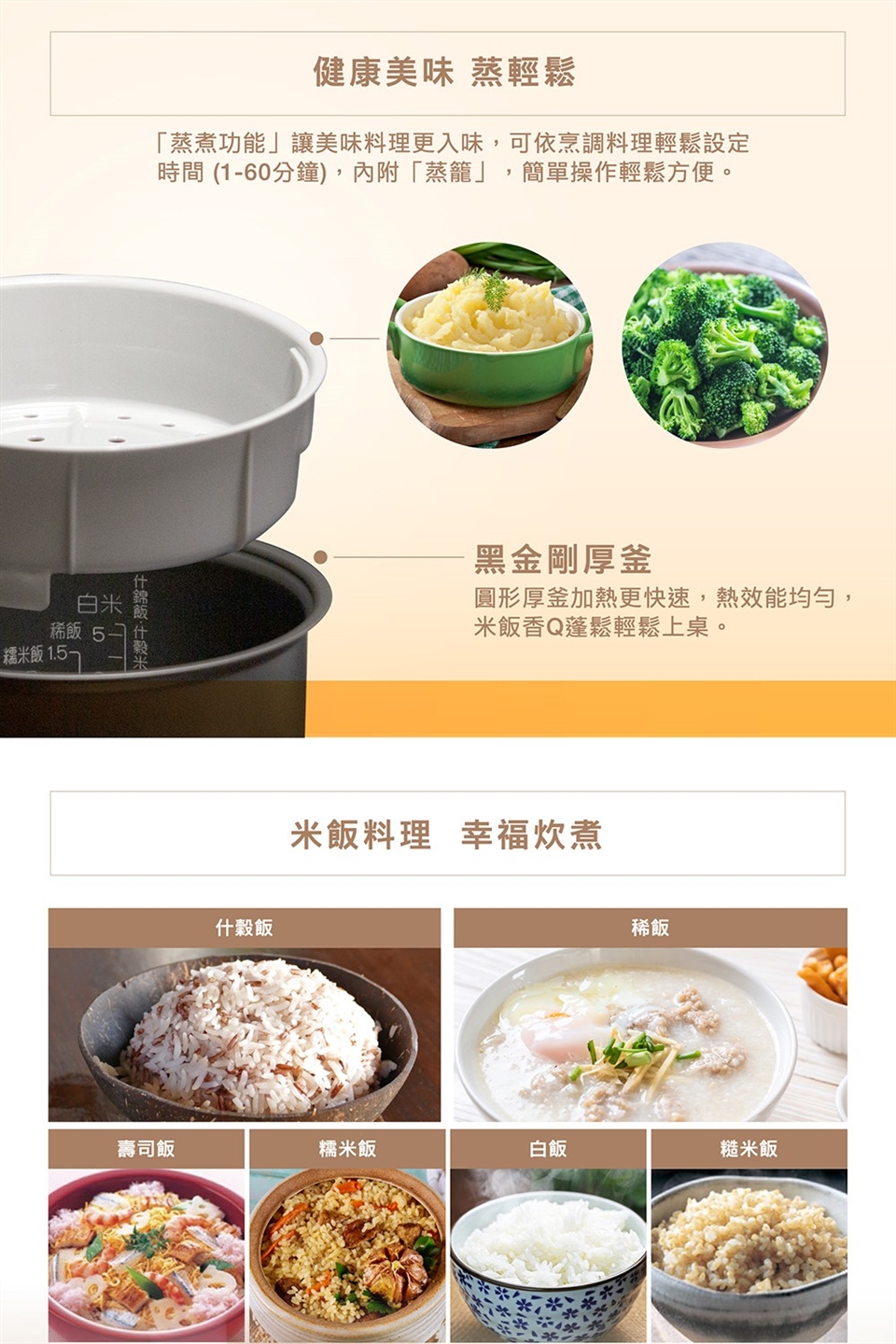 (5) 多樣炊煮功能,可炊煮白米、什榖米、糙米、什錦飯、壽司米、糯米飯、稀飯。