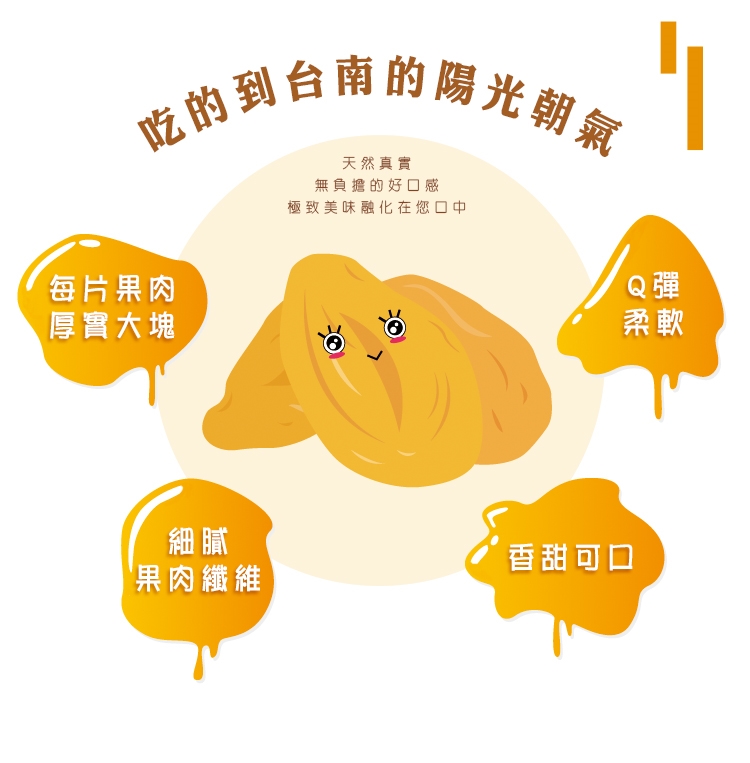 果乾表面若有白色結晶或顏色較深為糖分自然滲透現象,請安心食用。