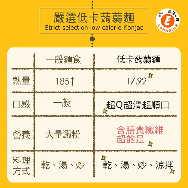 樂活e棧 低卡蒟蒻麵 鐵板細麵+5醬-商品特性