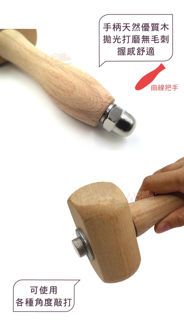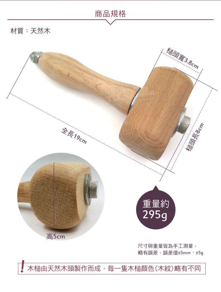 木槌由天然木頭製作而成,每一隻木槌顏色(木紋)略有不同
