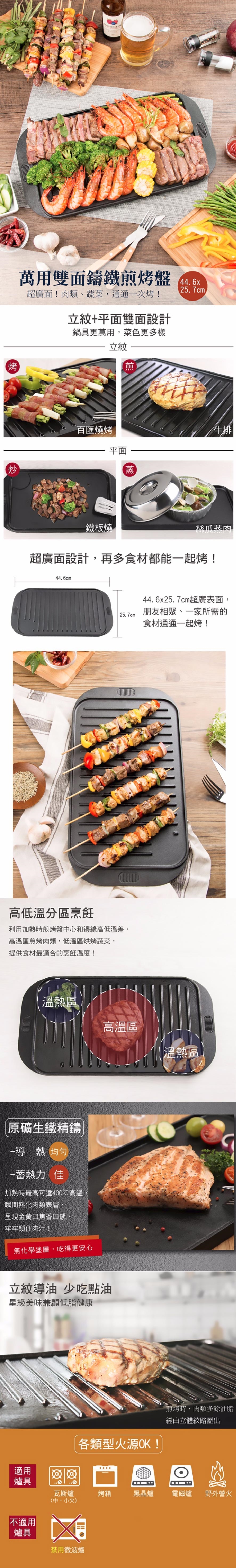 多功能雙面設計,使用功能更多樣化!煎牛排、烤肉…使用立紋面能大大提升食物質感;平面可用於鐵板燒、烤肉、煎食….一鍋多用,料理多樣增添美味!