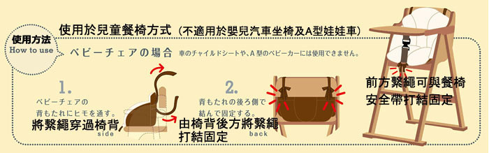 3. 使用產品時,須與娃娃車或餐椅原有的扣帶或綁繩配合使用。