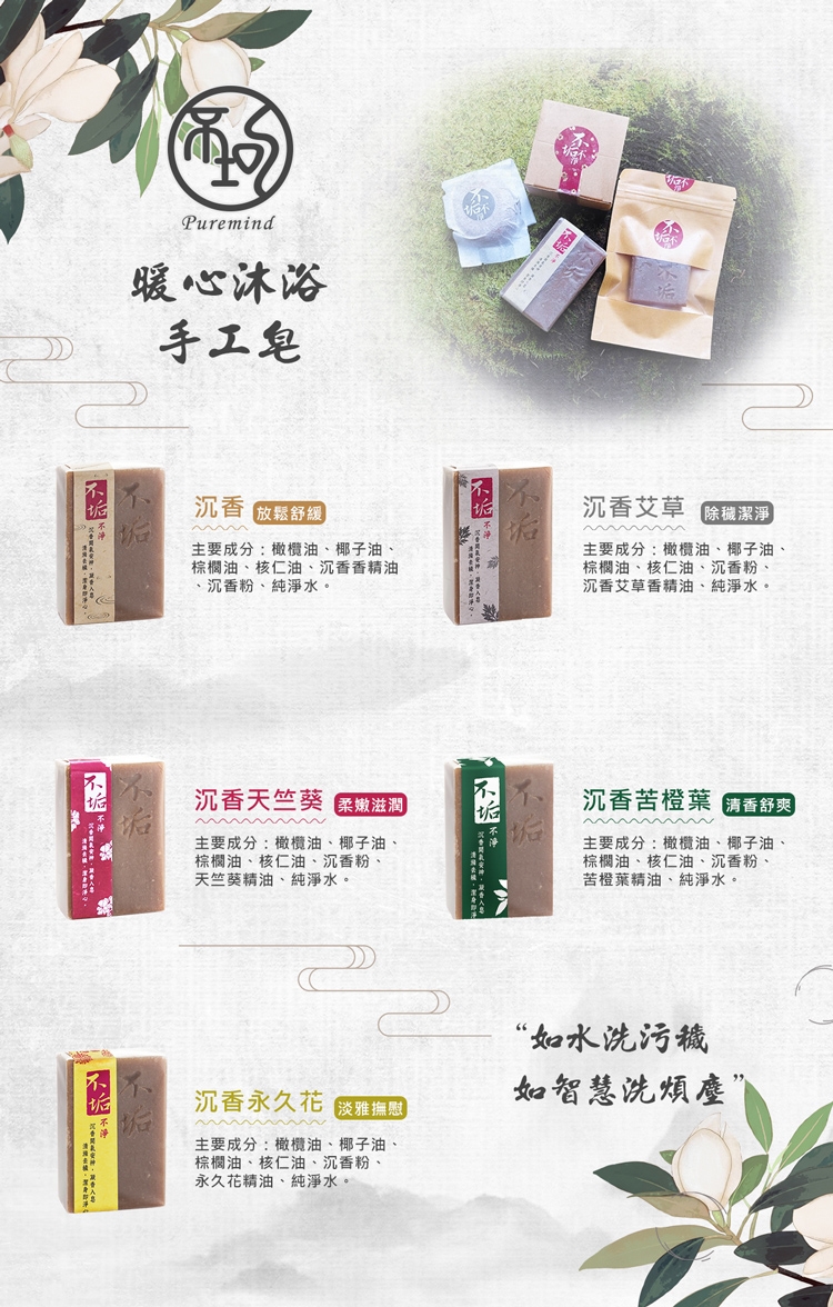 不垢的沉香系列商品中,每一顆皂和髮餅均添加產自印尼的沉香細脂粉,香氣清逸典雅,清淨的沐浴養護。