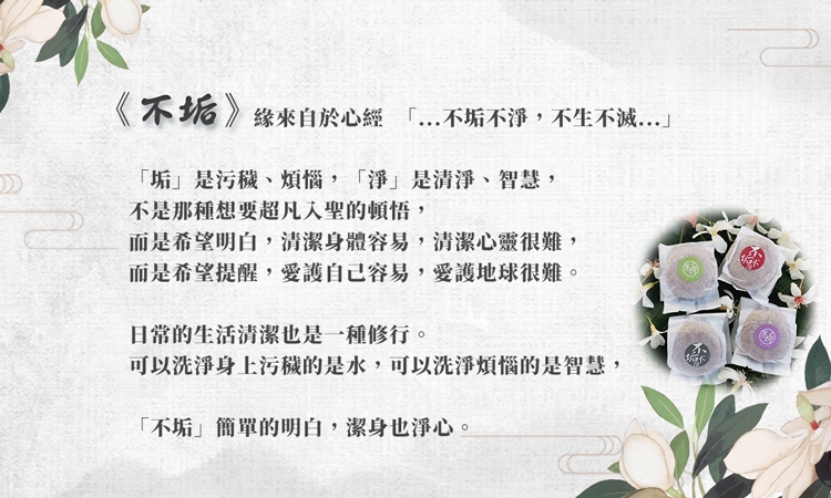「如水洗污穢,如智慧洗煩塵」是不垢主要品牌精神與品牌偈語。