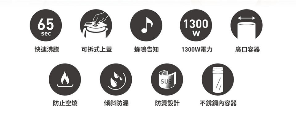 (4) 1300W的強力電量,1杯水量(140ml)只需約65秒快速煮沸;滿水水量(1L)沸騰所需時間:約5分鐘。
