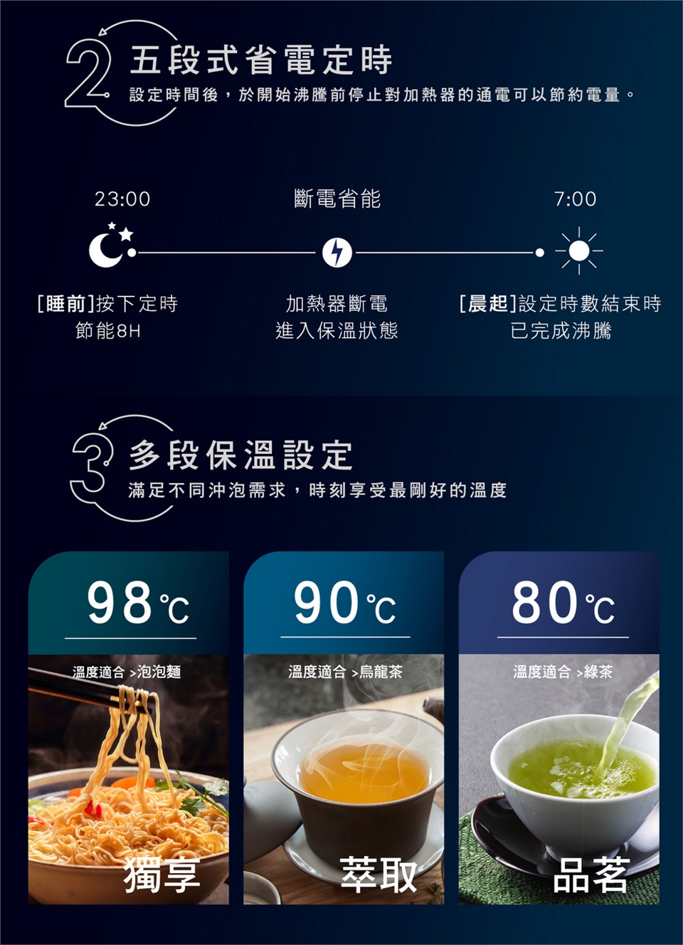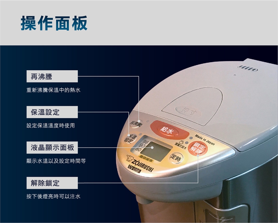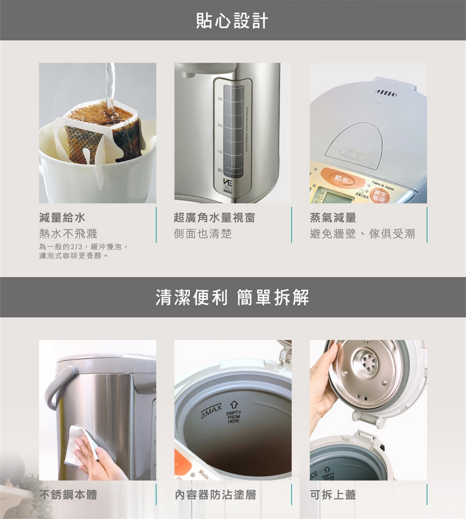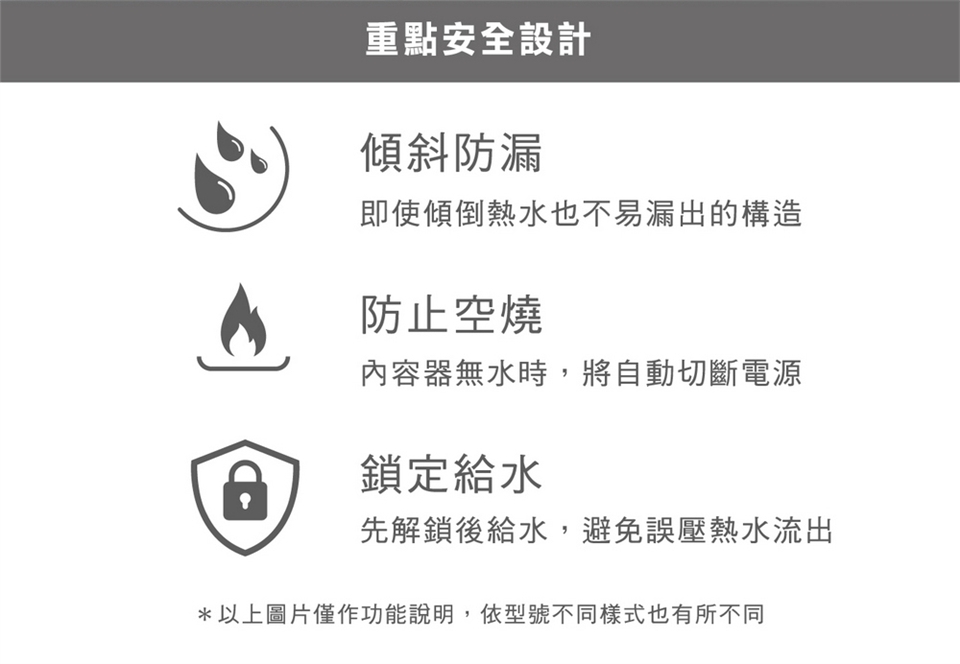 (7) 安全裝置:防止空燒/防止傾斜時熱水溢出/上蓋2段式開啟設計。