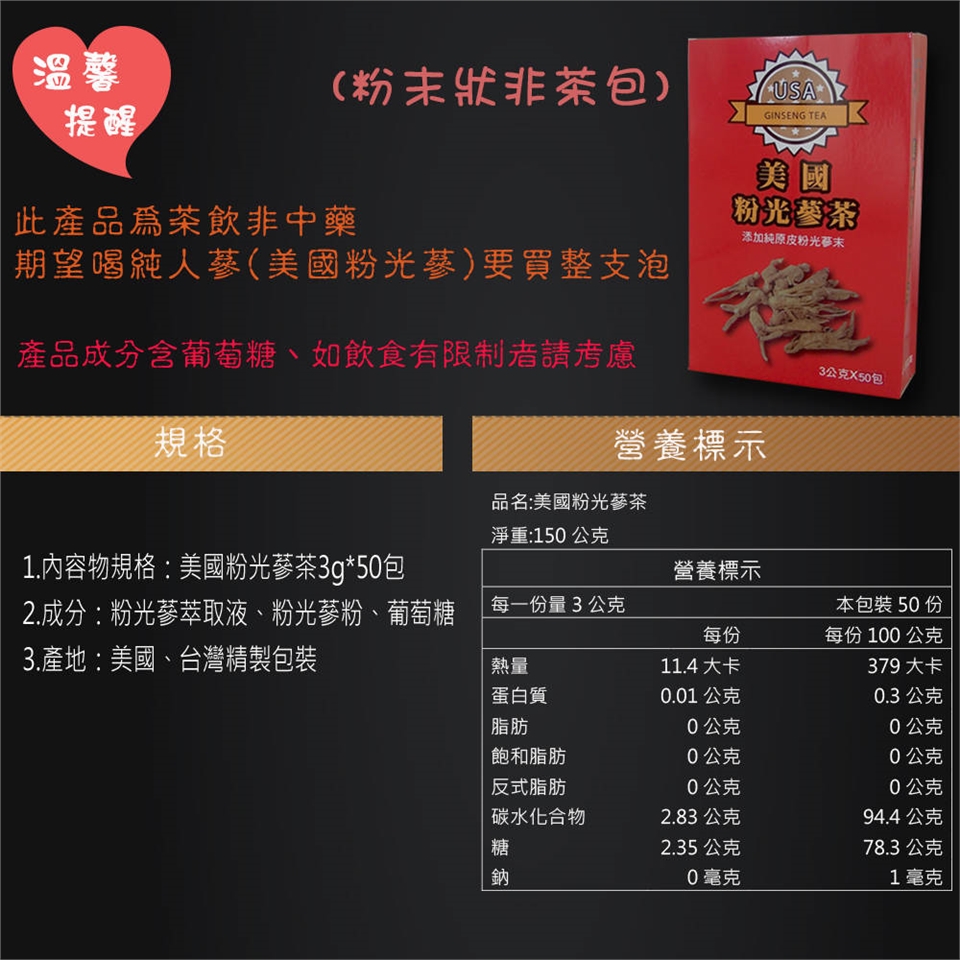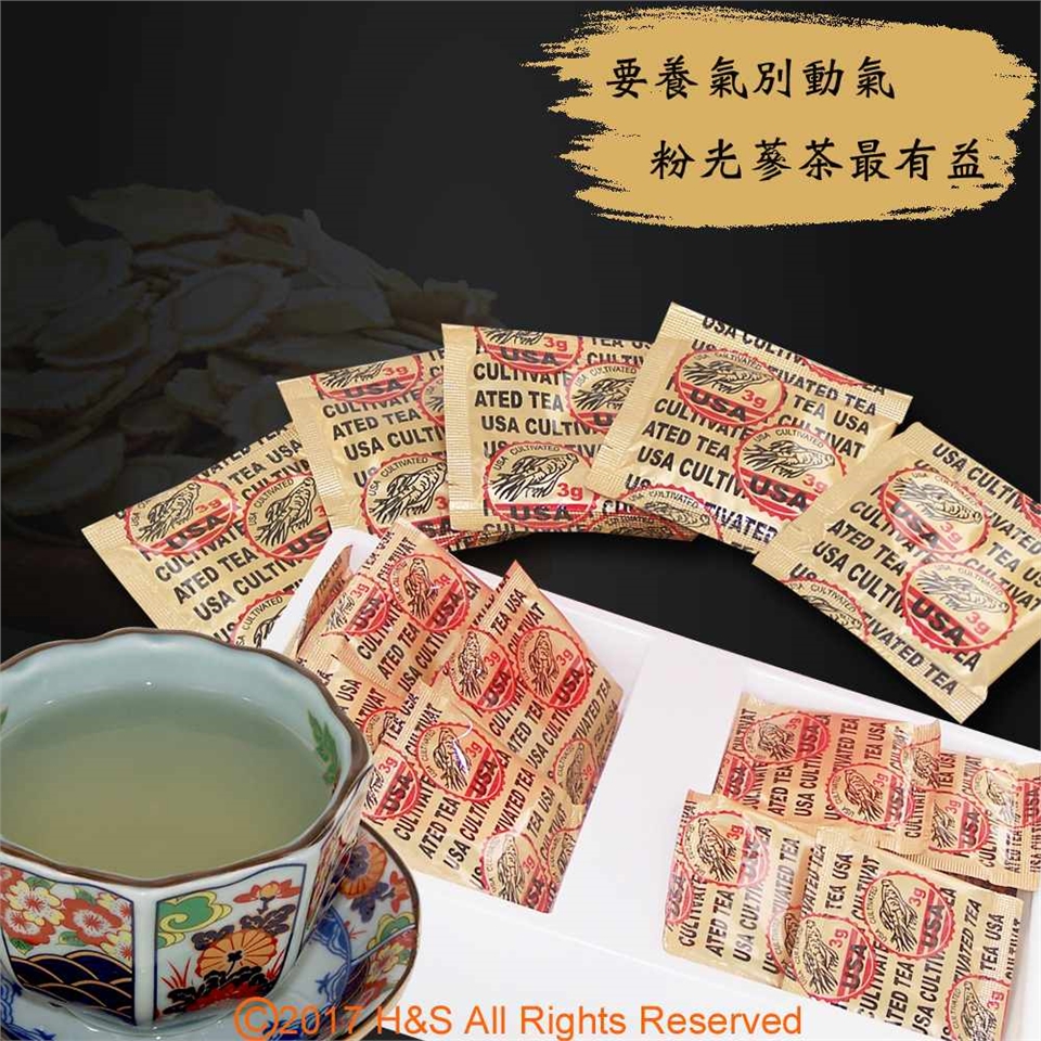 嚴選美國三大洲粉光蔘產區原料製作,產品以真空茶包裝填,完全不含色素及防腐劑。一年四季的好飲品,年齡及性別不拘、男女老少均適合。攜帶方便,無論居家、辦公室、露營外出洽公等等,沖泡簡單、方便。