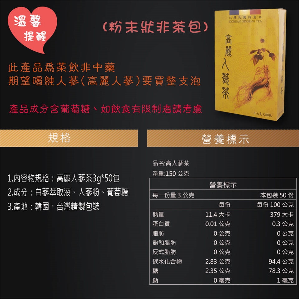 嚴選韓國進口高麗優質人蔘原料製作,產品以真空茶包裝填,完全不含色素及防腐劑,一年四季的好飲品,年齡及性別不拘、男女老少均適合。攜帶方便,無論居家、辦公室、露營外出洽公等等,沖泡簡單、方便。