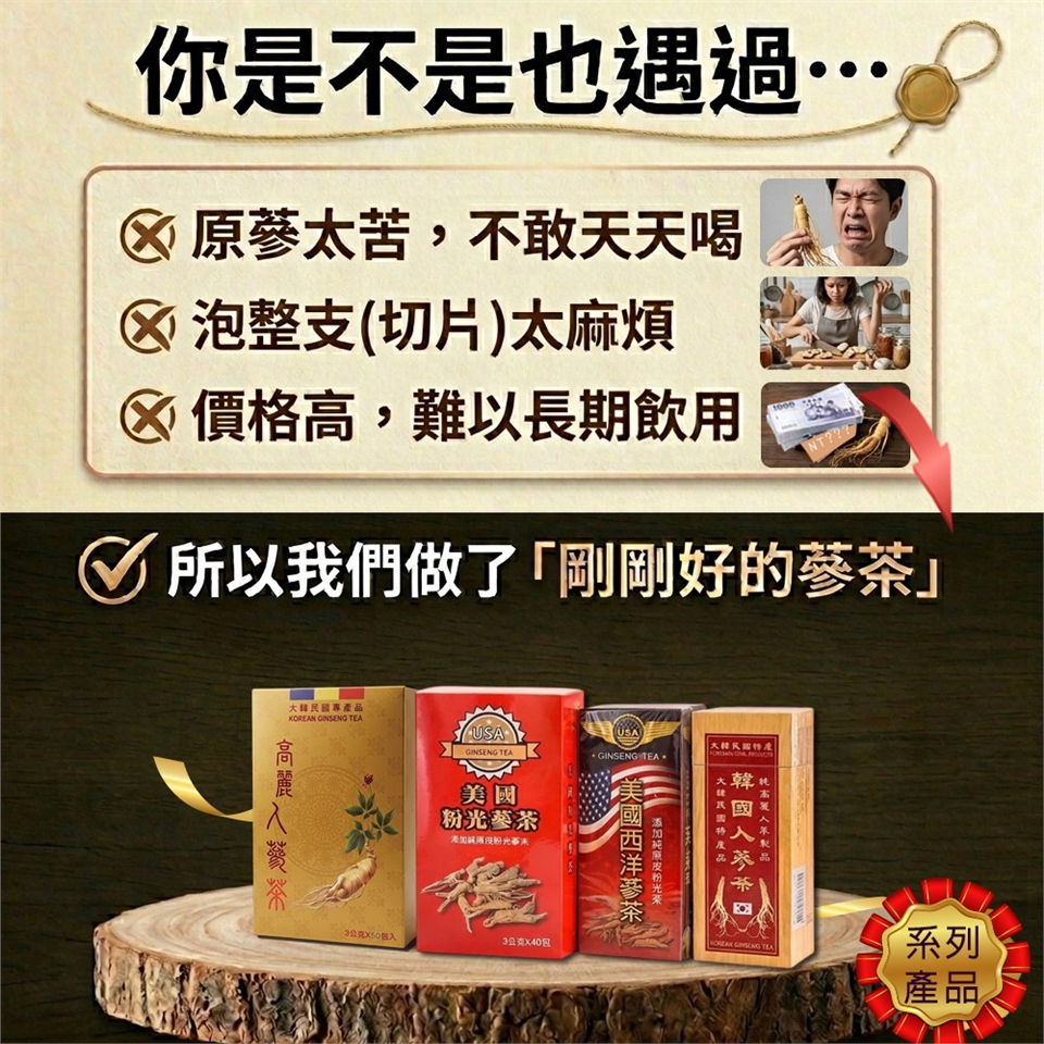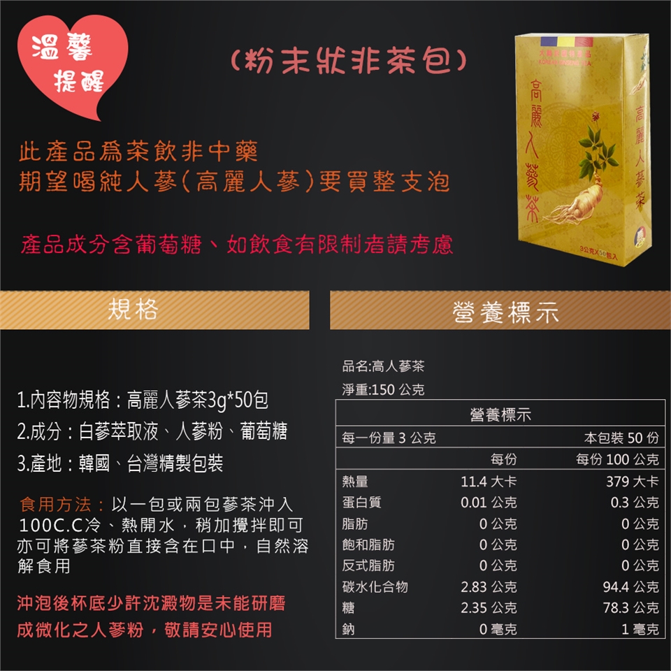 A.內容物規格及成分:韓國高麗人蔘茶3g*50包