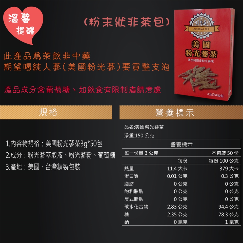 A.內容物規格及成分:美國粉光蔘3g*50包