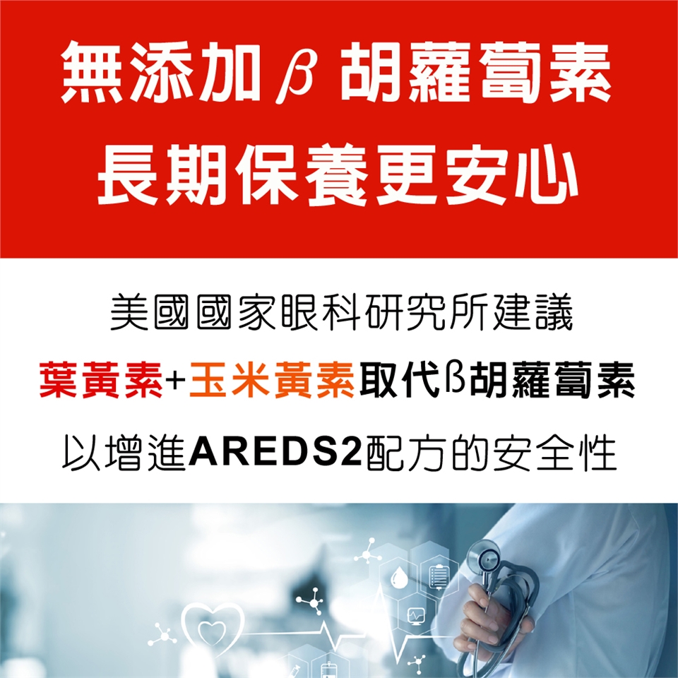本品無添加ß胡蘿蔔素,1994年的一項研究發現,攝取ß胡蘿蔔素可能會增加抽菸者罹患肺癌的風險,因此美國國家眼科研究所建議以葉黃素+玉米黃素取代ß胡蘿蔔素的補充更安全。
