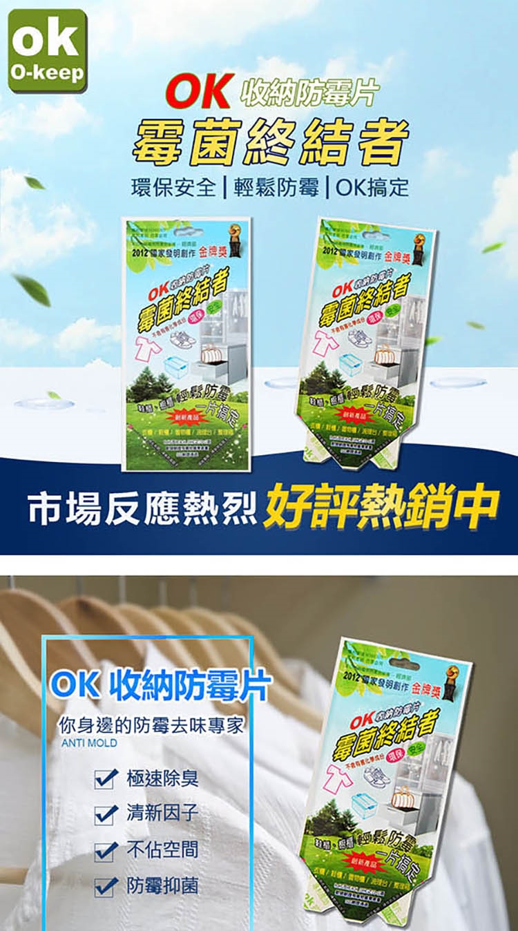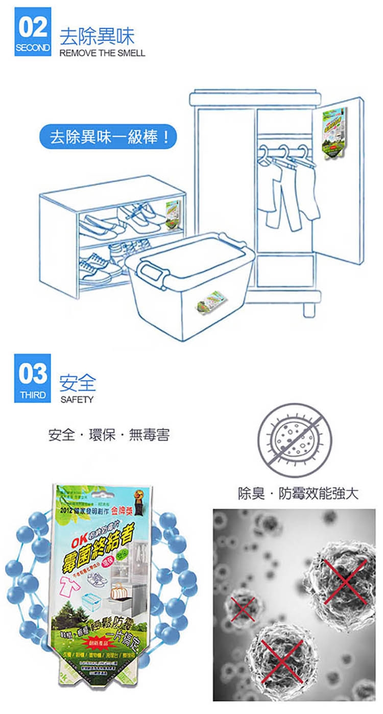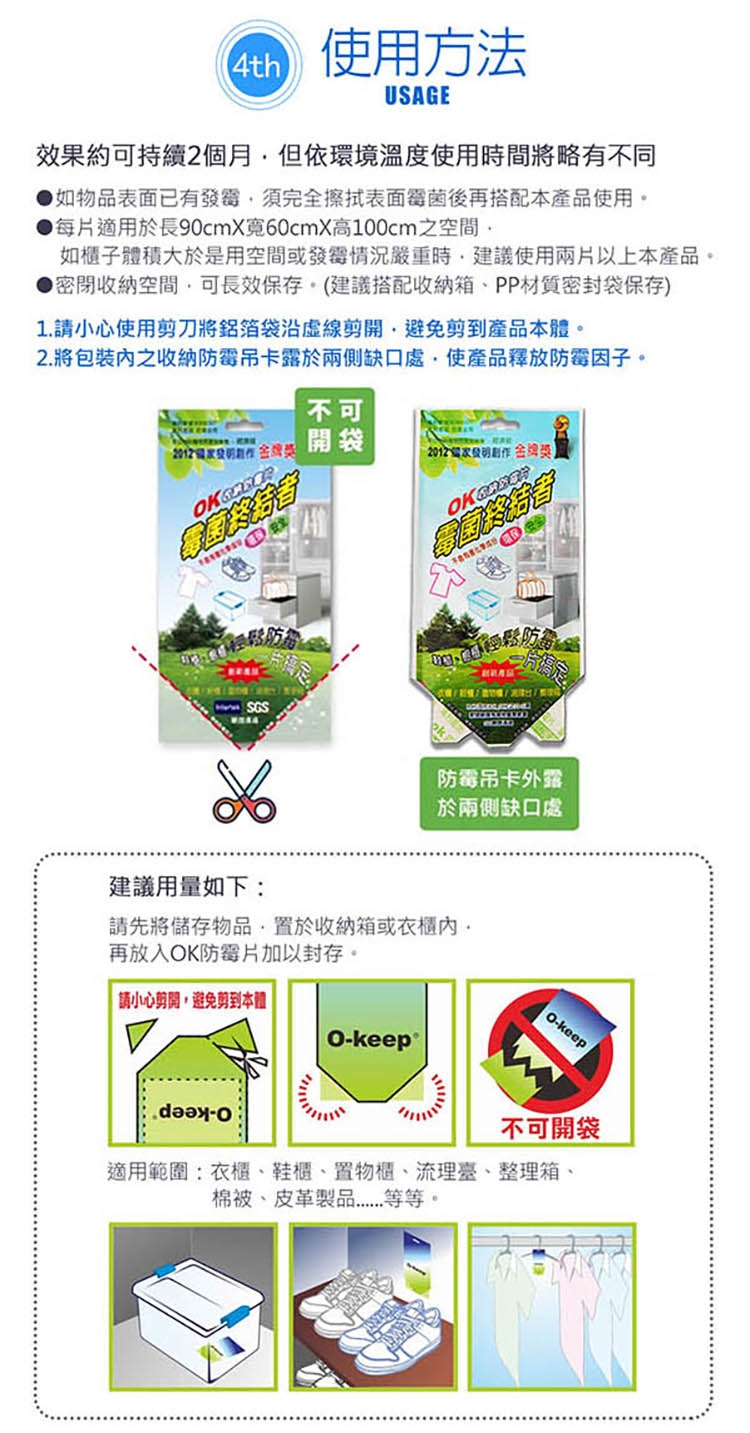 •每片適用於約 長90cm x 寬60cm x 高100cm之空間,如櫃子體積大於適用空間或發霉情況嚴重時,建議使用兩片以上之OK 收納防霉片。
