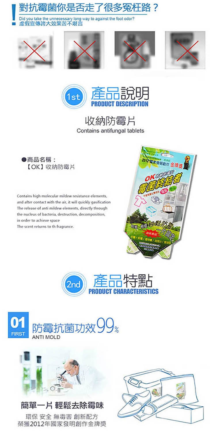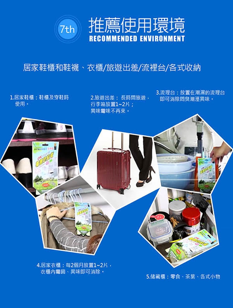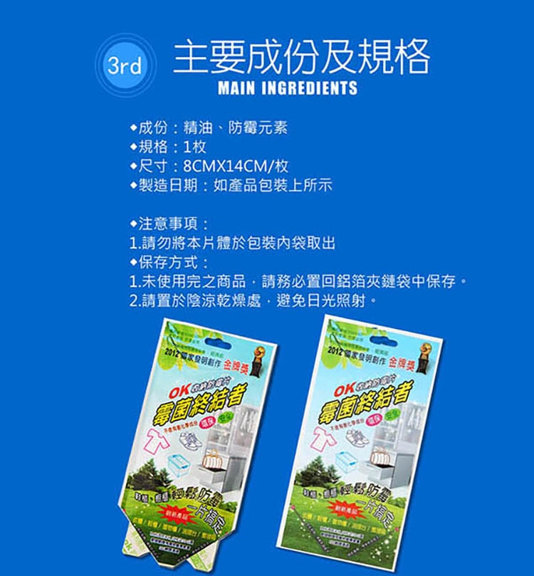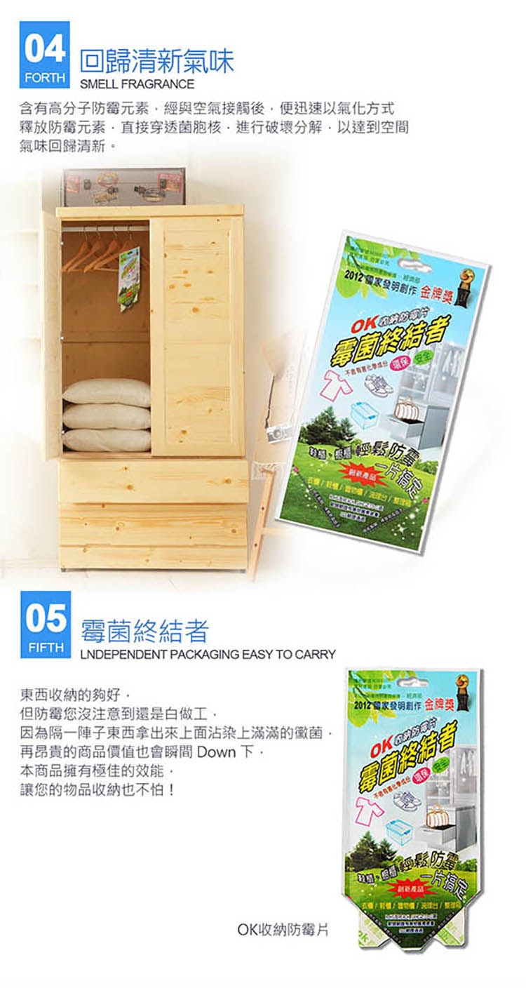 •每片適用於約 長90cm x 寬60cm x 高100cm之空間,如櫃子體積大於適用空間或發霉情況嚴重時,建議使用兩片以上之OK 收納防霉片。