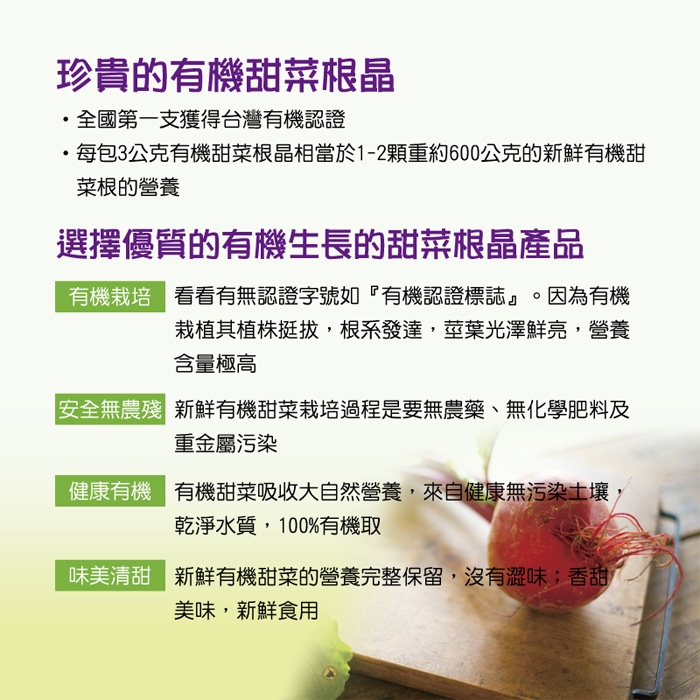 - 安全無農殘:新鮮有機甜菜栽培過程是要無農藥、無化學肥料及重金屬污染。
