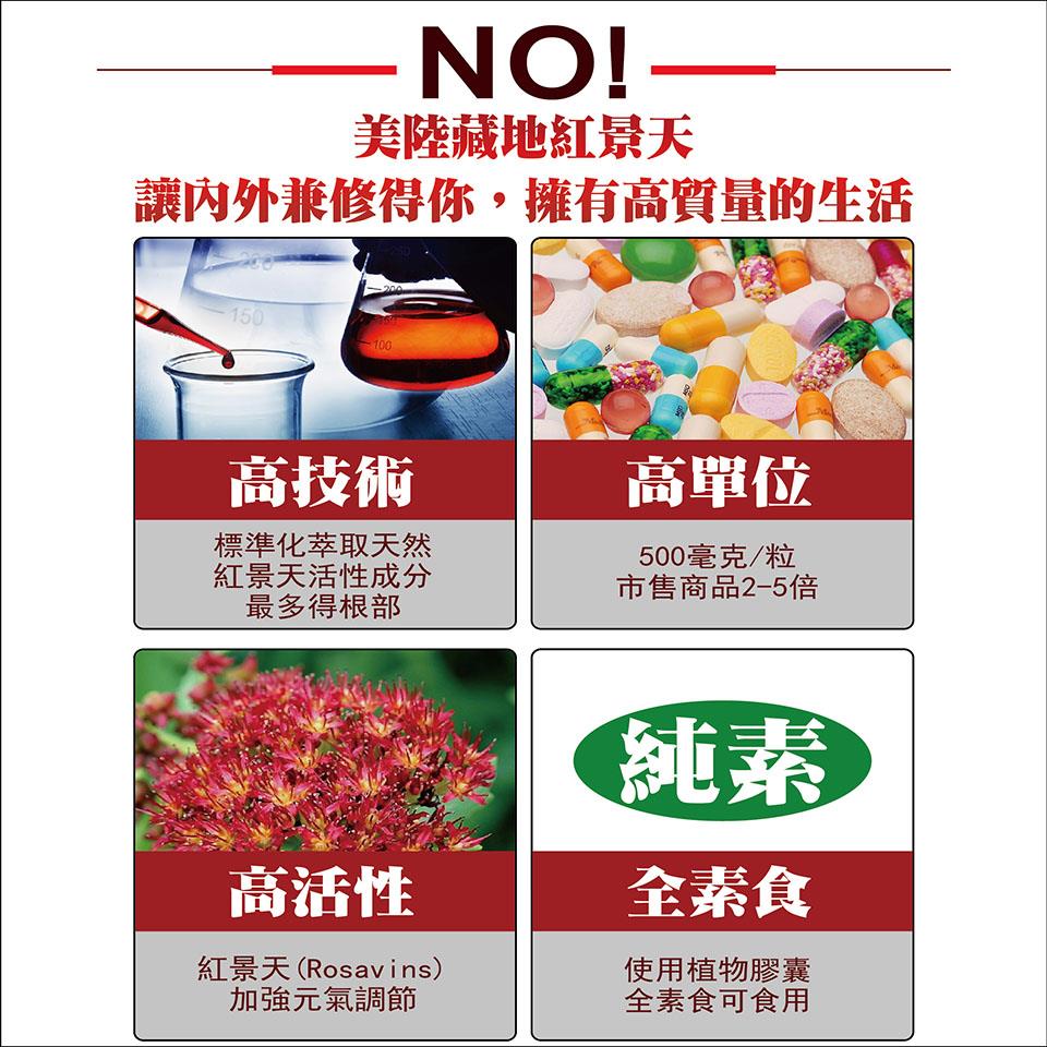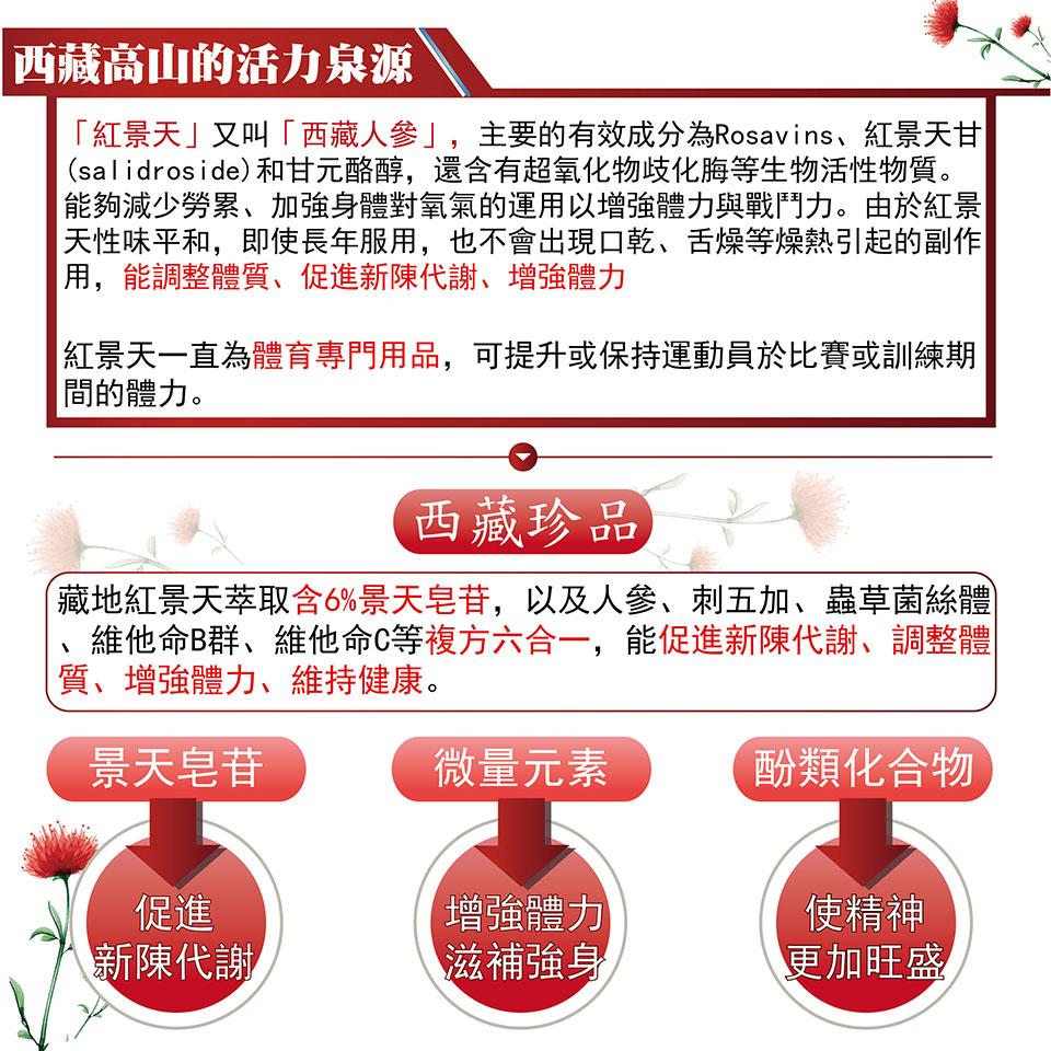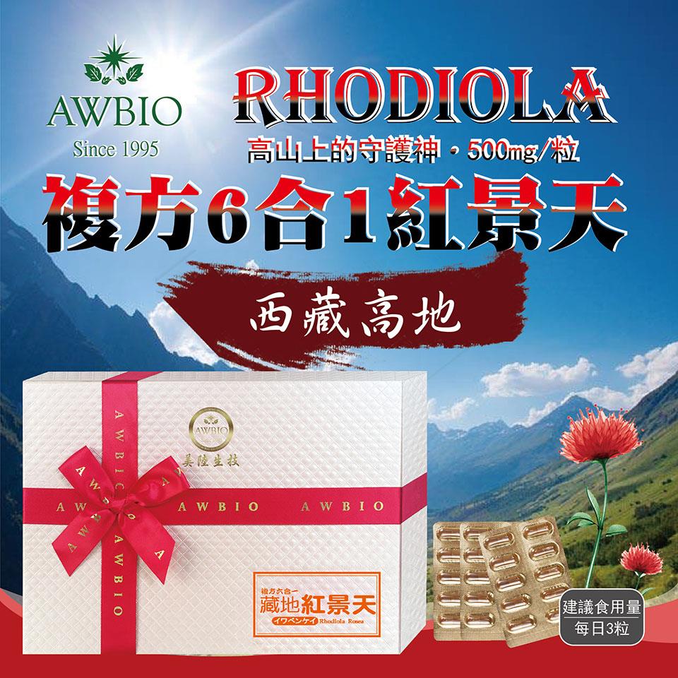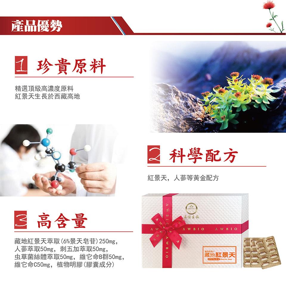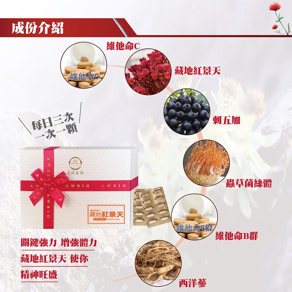 【美陸生技AWBIO】紅景天產品詳細說明:成分:藏地紅景天萃取(6%景天皂苷)250毫克,人蔘萃取50毫克,刺五加萃取50毫克,蟲草菌絲體萃取50毫克,維他命B群50毫克,維他命C50毫克,植物明膠(膠囊成分)