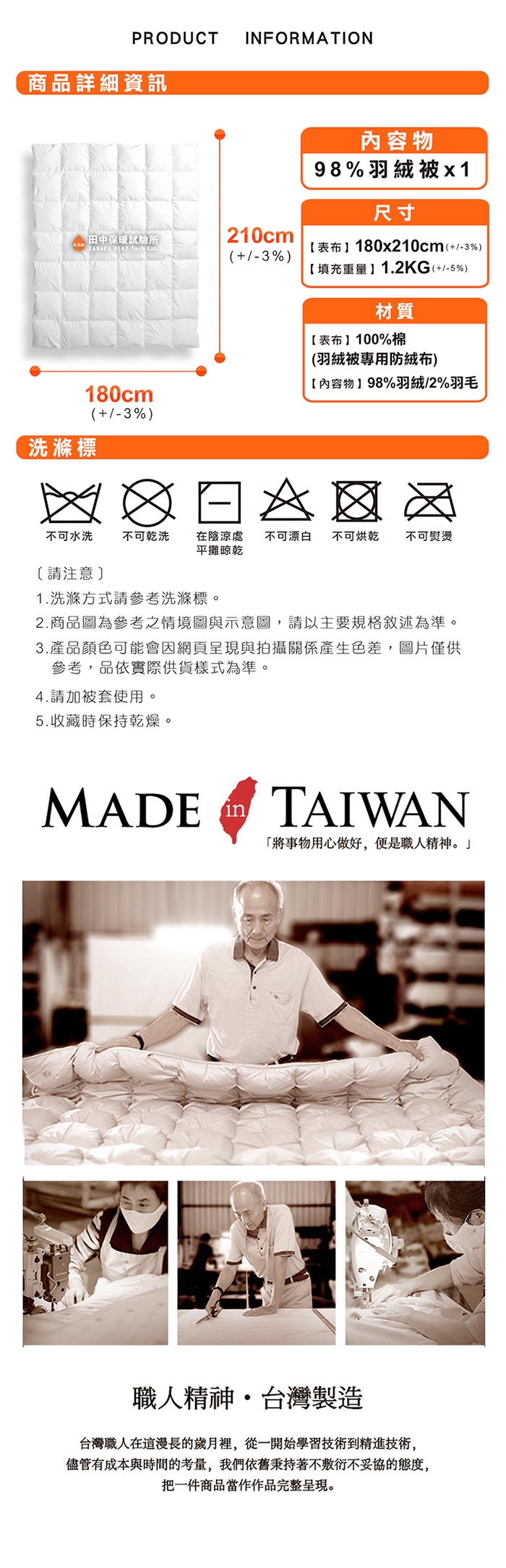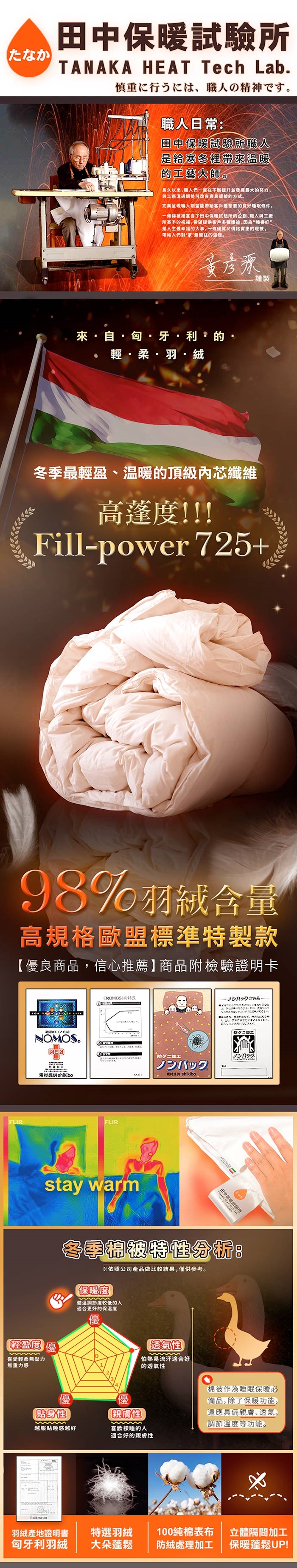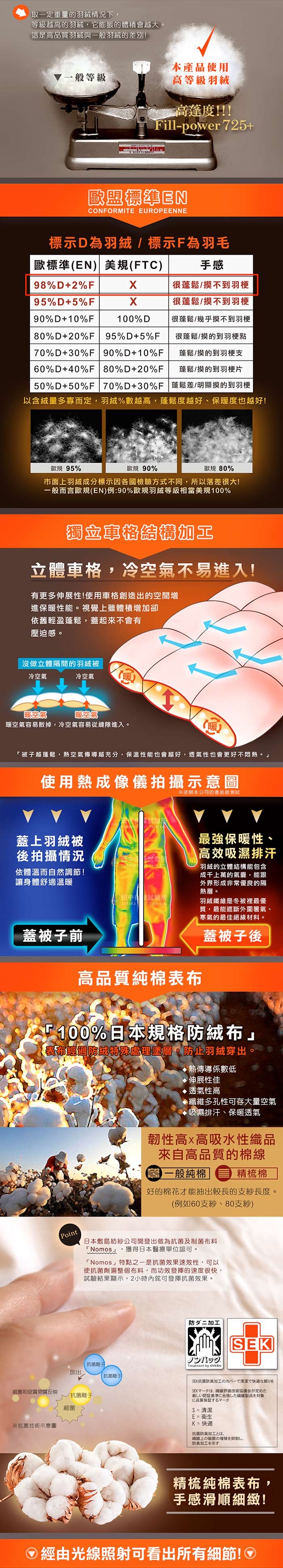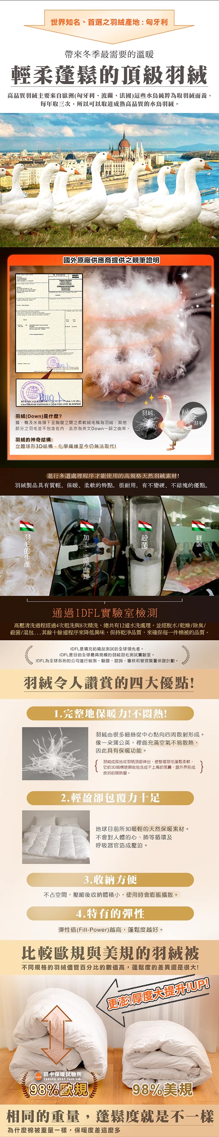 內材 : 歐規EN98%羽絨(產地:匈牙利)、羽毛2%