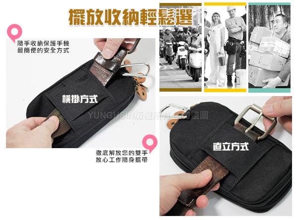 多功能腰掛皮套可採用掛勾直立吊掛在腰際,或將皮帶穿過皮套後方採用橫式固定在腰際左側