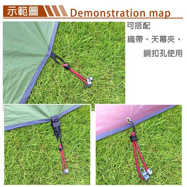 ◆ 彈力掛勾可緩衝風力對營繩的拉力,減少強大風力拉扯損壞天幕。