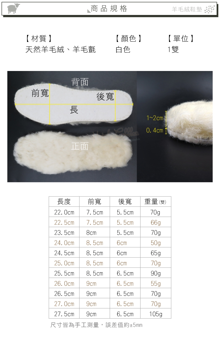 長度22.0cm 前寬7.5cm 後寬5.5cm 重量70g(雙)