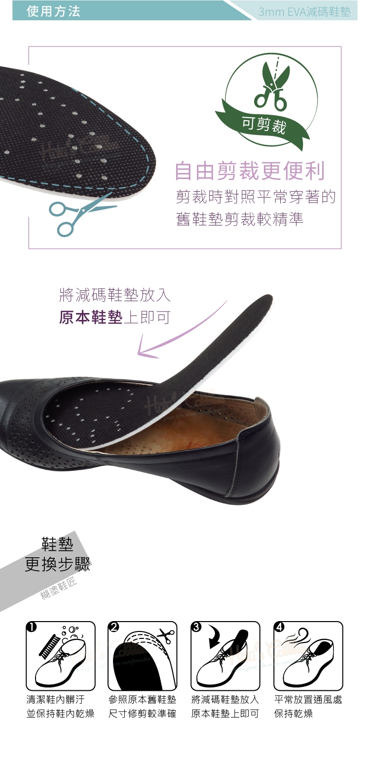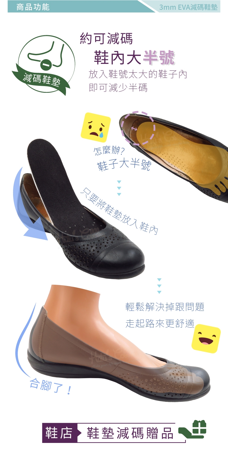 1.減碼鞋墊:約可減碼鞋內大半號,放入鞋號太大的鞋子內即可減少半碼